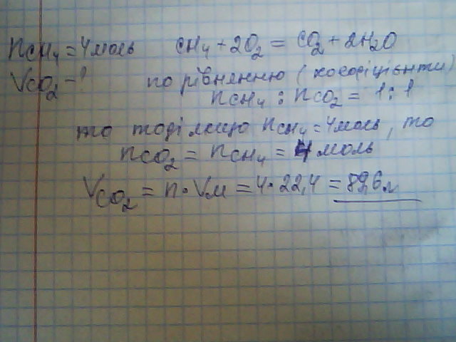 При спалювани метана килькистью речовини 4 моль утворився вуглекислий газ об'эмом (н,у)