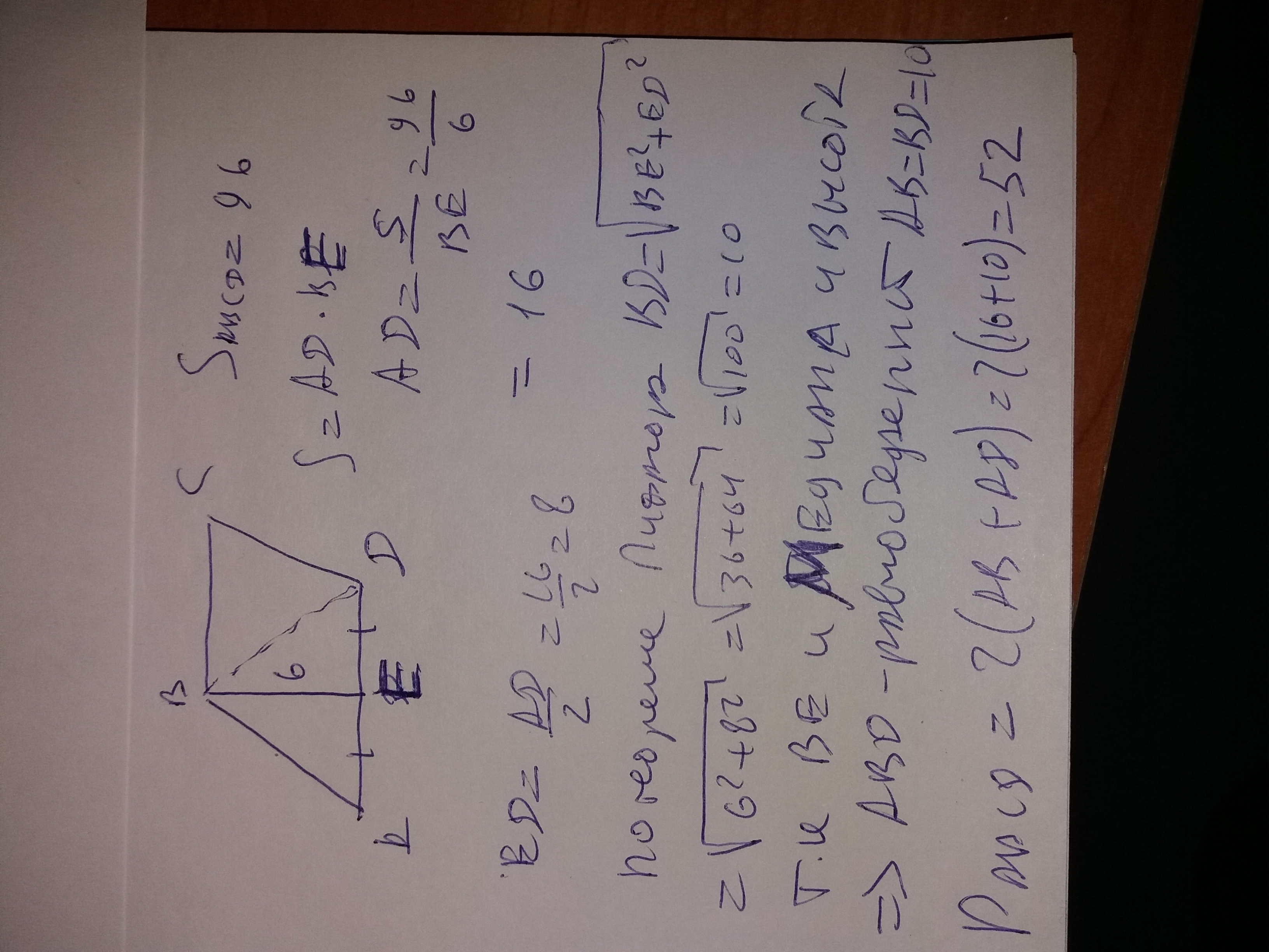 в параллелограмме АВСD перпендикуляр, опущенный из вершины В на сторону АD, делит ее пополам. найдите периметр параллелограмма, если площадь параллелограмма 96, перпенликуляр ВD=6