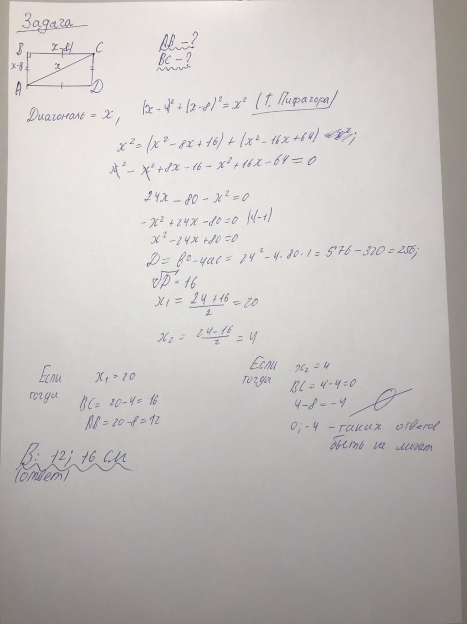 Диаганаль прямоугольника на 8 больше одной из его сторон и на 4 см больше другой. Найдите стороны прямоугольника.