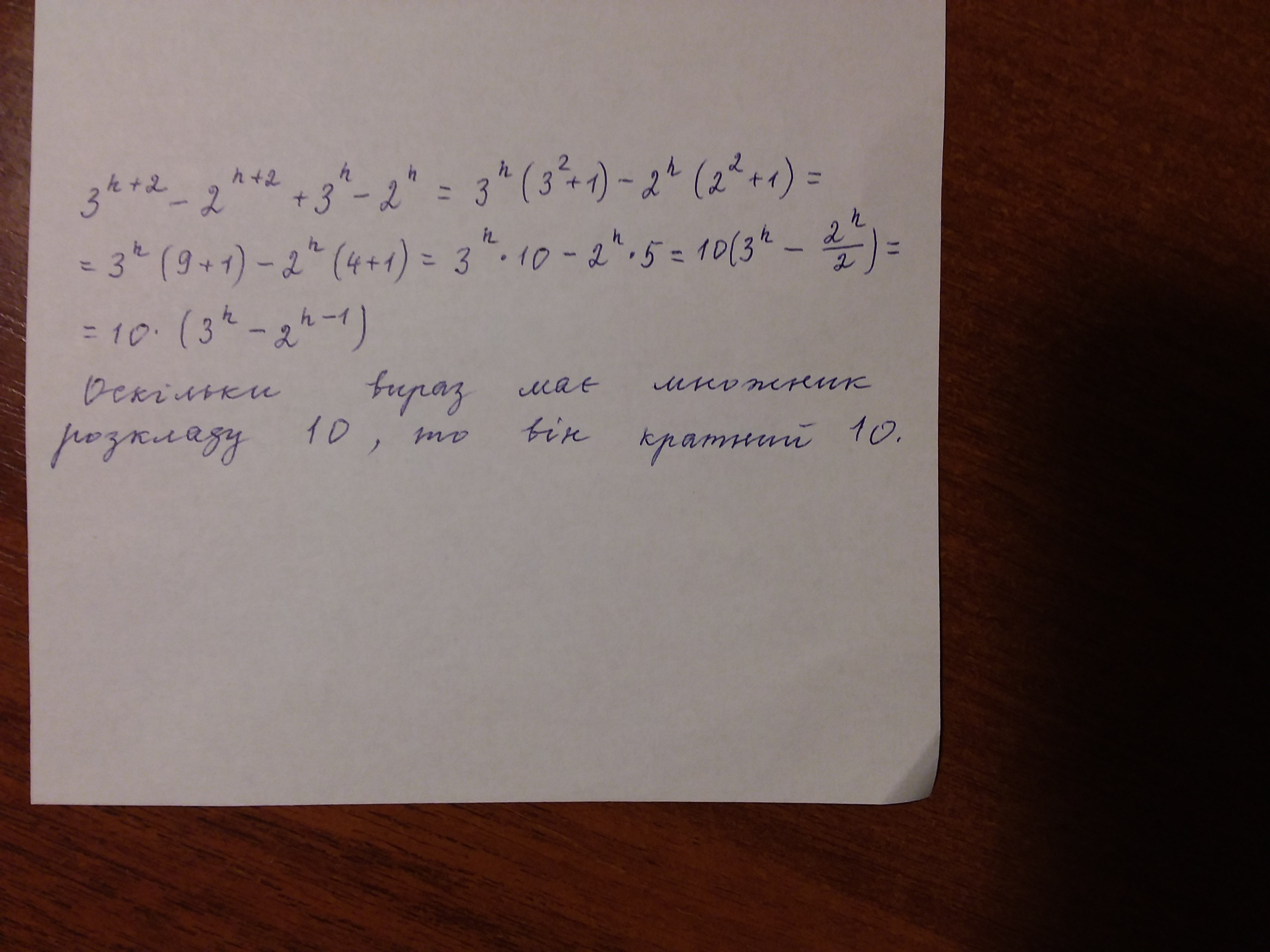 Доведіть що при будь-ікому натуральному n значення виразу 3^n+2 -2^n+2 +3^n -2^n ділиться націло на 10