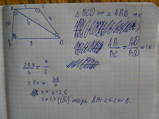 Основания трапеции равны 4 см и 9 см, а одна из диагоналей 6 см. Определить Боковые стороны трапеции, если одна из них больше другой на 2.5 см