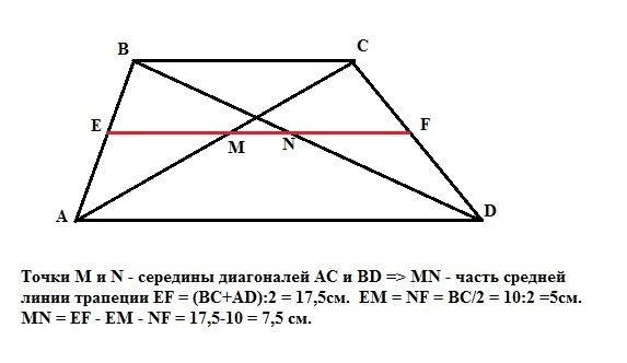 Точки M и N - середины диагоналей АС и BD => MN - часть средней линии трапеции EF = (BC+AD):2 = 17,5см.