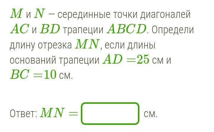 M и N — серединные точки диагоналей AC и BD трапеции ABCD. Определи длину отрезка MN, если длины оснований трапеции AD=25 см и BC=10 см.