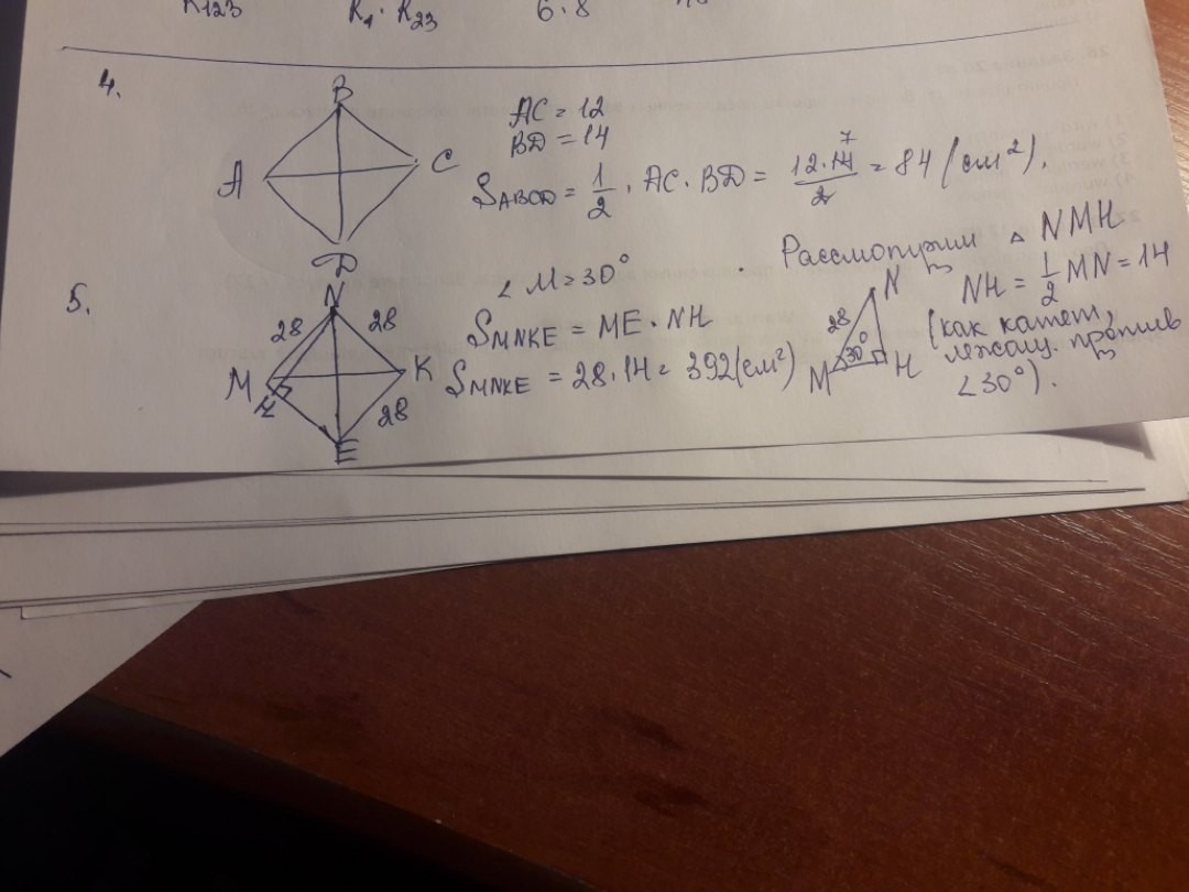 5.В ромбе MNKE ∠М=30˚. NH – высота, проведенная к стороне ME. NK=28 см. Найдите площадь ромба.