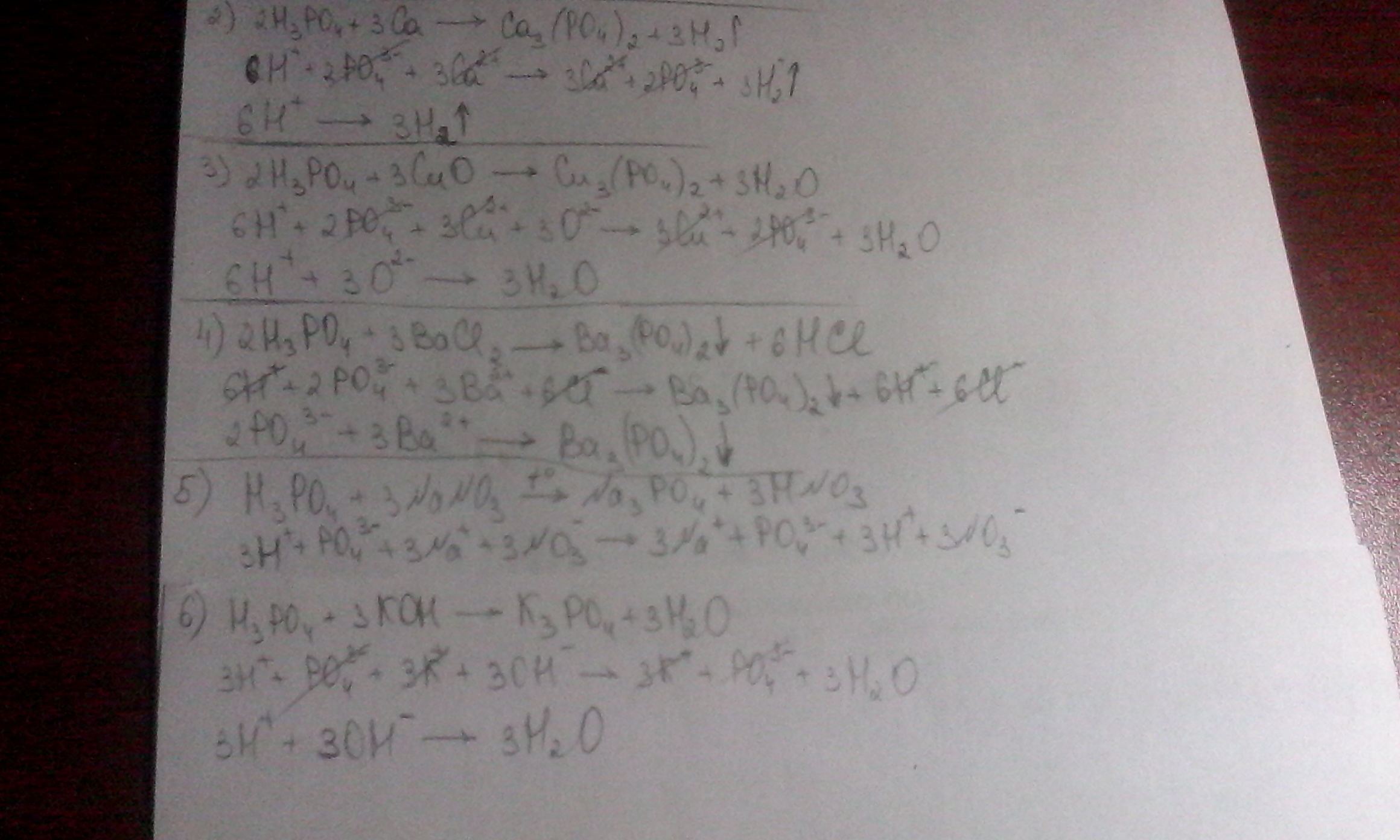 С какими веществами будет реагировать фосфорная кислота: гидроксид железа (II), кальций, оксид серы (VI), оксид меди, хлорид бария, медь, нитрат натрия, азотная кислота, гидроксид калия. Составьте уравнения реакций в ионном виде.