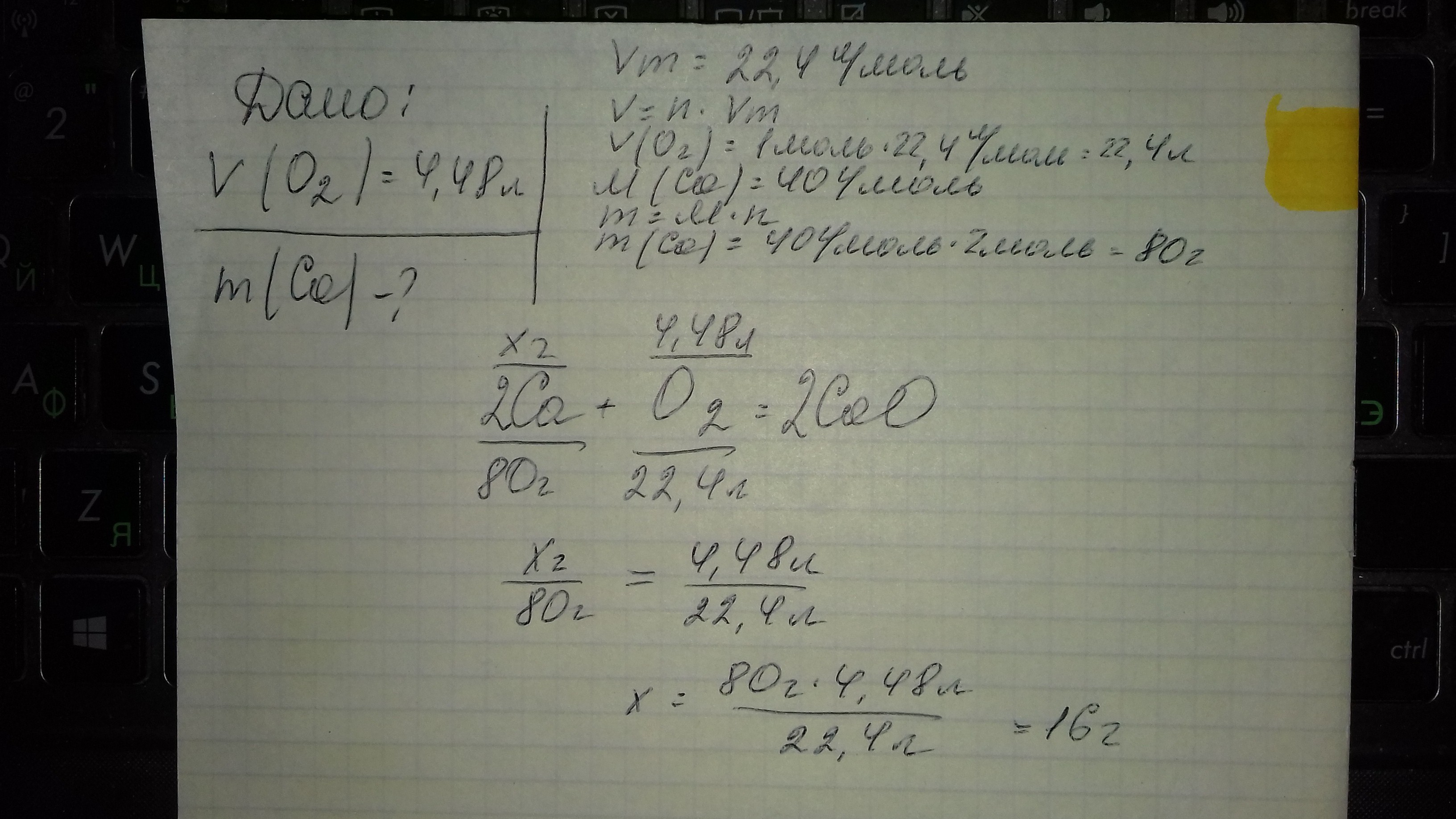 Найти массу кальция, который прореагирует с кислородом объёмом 4,48 л (н.у.).