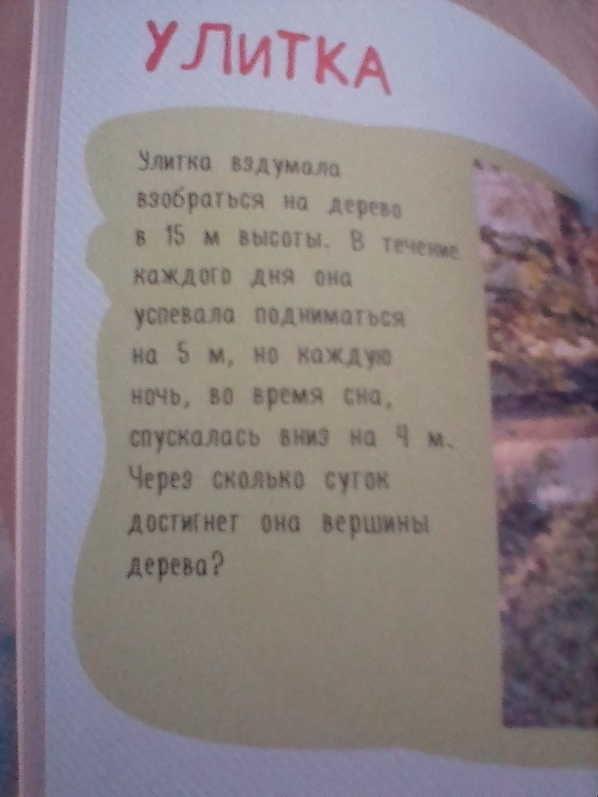 улитка ползет по дереву в высоту 15м за день она поднимается на 5 м а за ночь спускается на 4 м за сколько суток поднимится улитка до самого верх