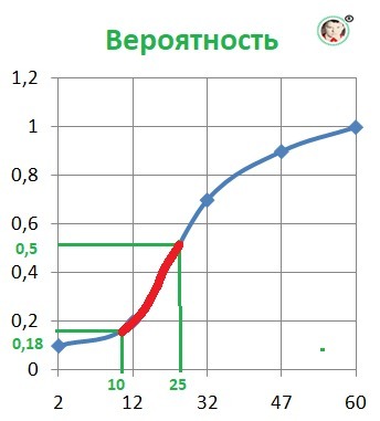 Из графика можно найти: F(0-25) ≈ 0,5 и F(0-10) ≈ 0.18.