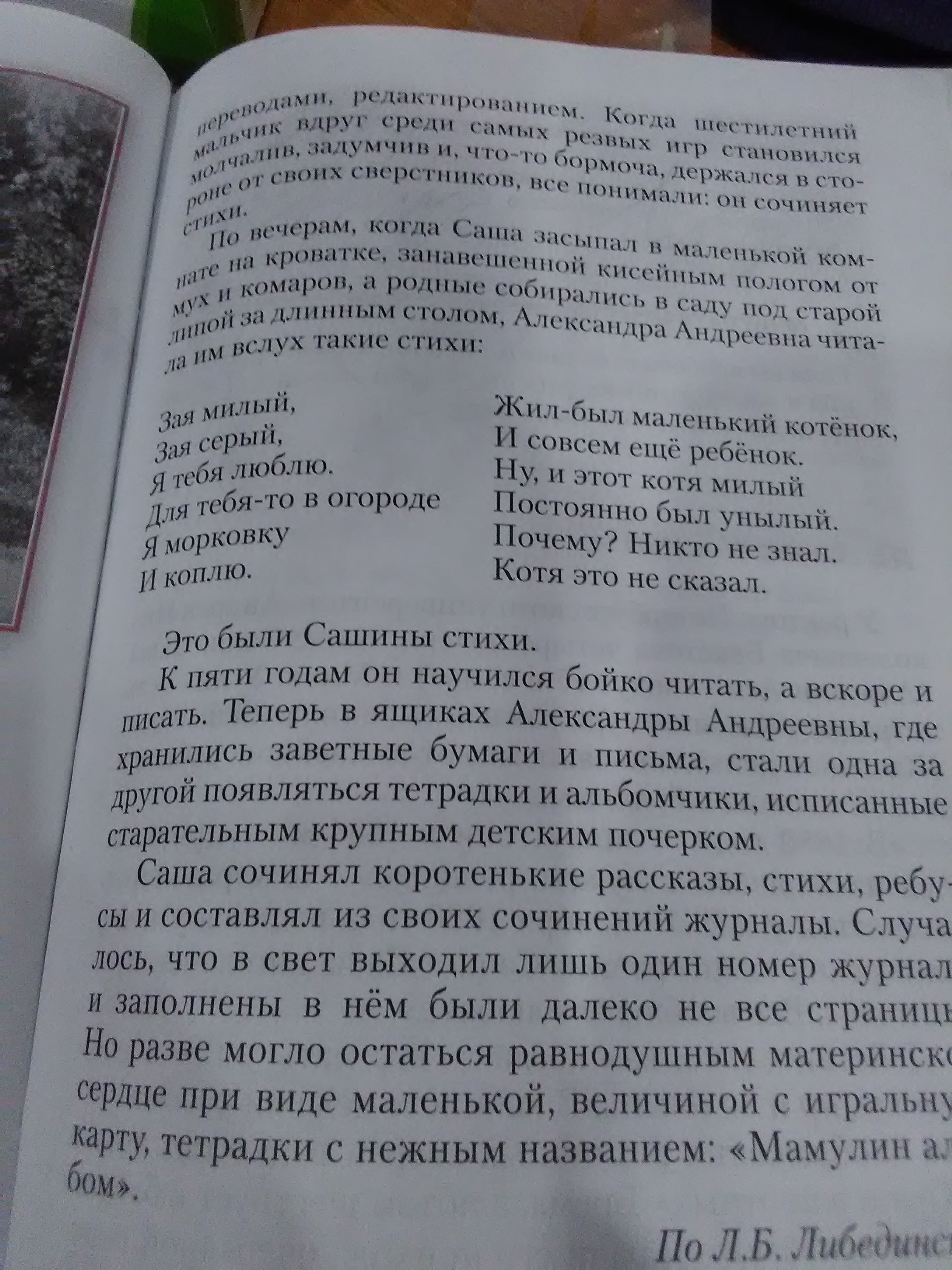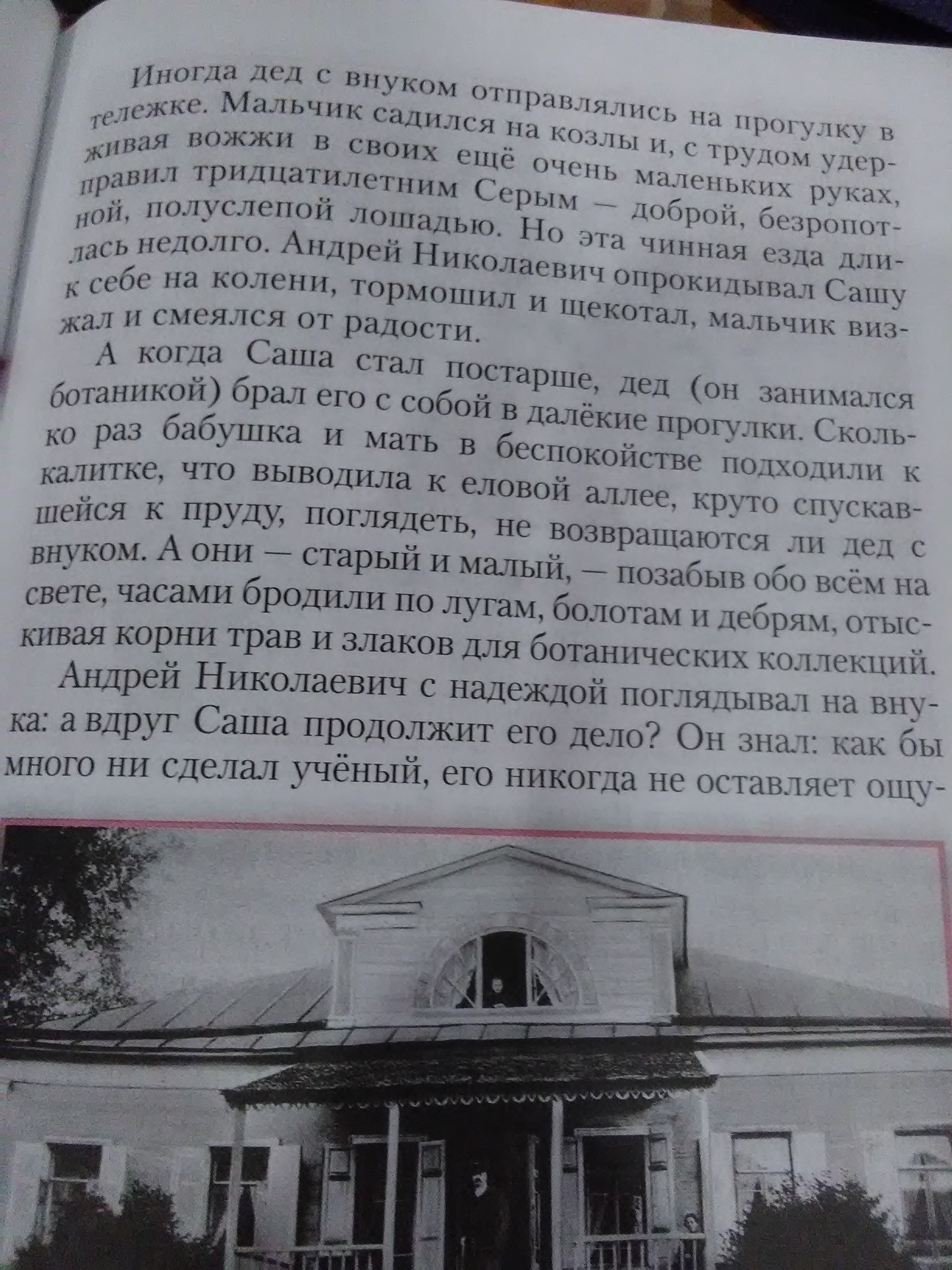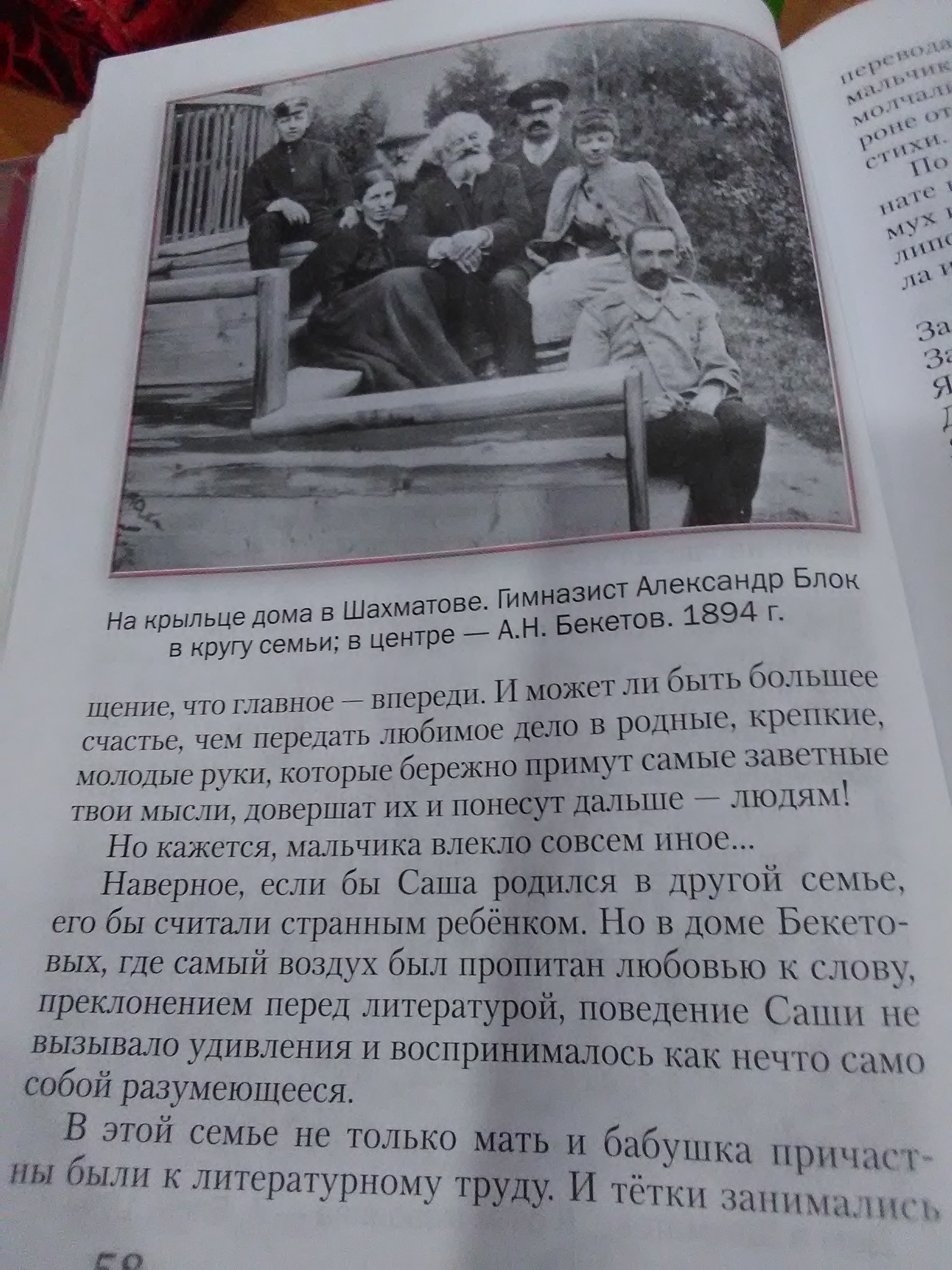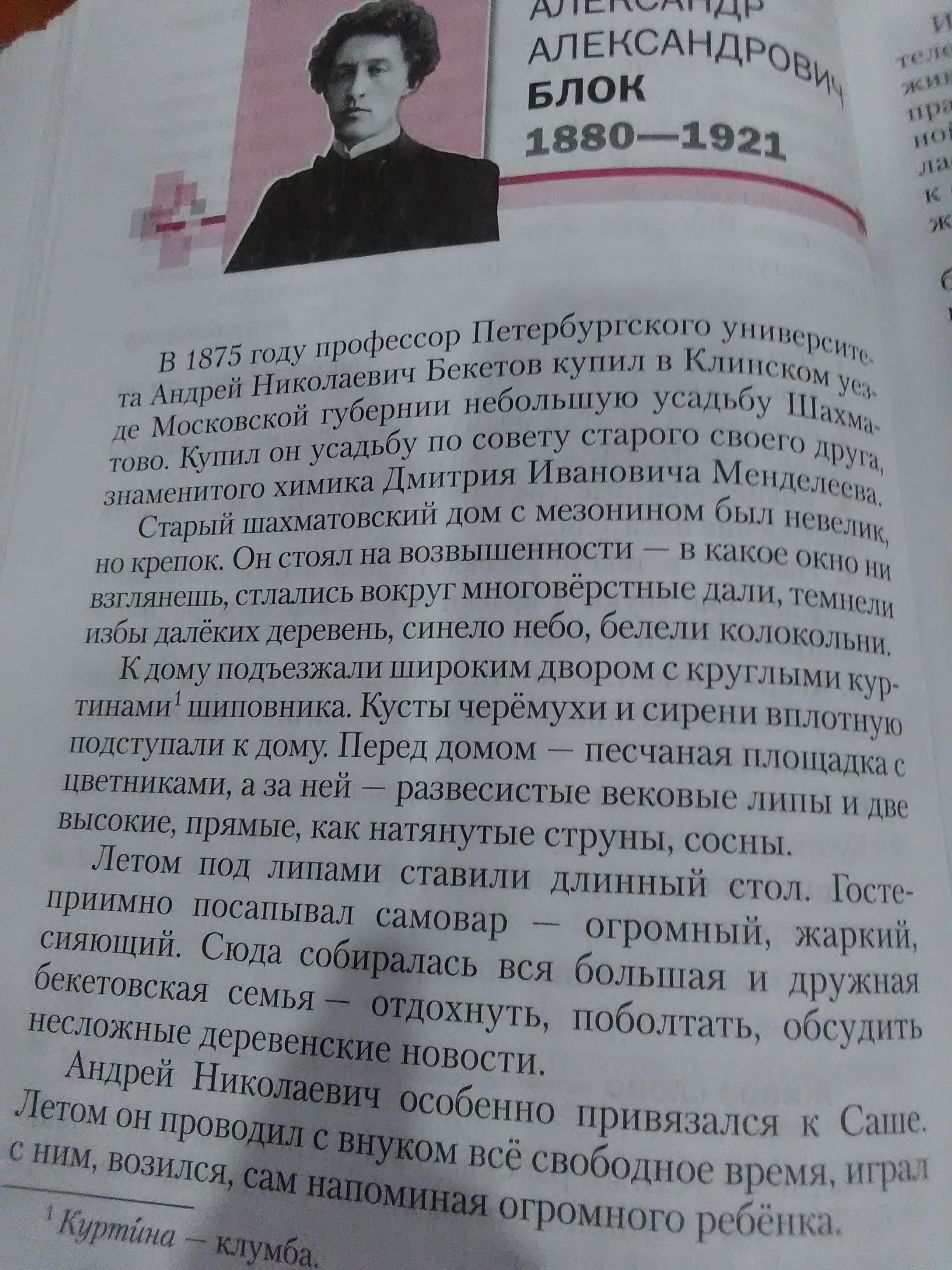 в 1875 году профессор Петербурского университета Андрей Николаевич Бекетов купил в Клинском уезде Московской губернии небольшую усадьбу Шахматово. Старый шахматовский дом с мезонином был невелик, но крепок. К дому подъезжали широким дворцом с круглыми куртинами шиповника. Перед домом- песчаная площадка с цветниками, а за ней- развесистые вековые липы и две высокие, прямые как натянутые струны, сосны. Летом под липами ставили длинный стол. Сюда собиралась вся большая и дружная бекетовская семья- отдохнуть, поболтать, обсудить несложные деревенские новости. Андрей Николаевич особенно привязался к Саше. Летом он проводил с внуком все свободное время играл с ним, возился, сам напоминая огромного ребенка.