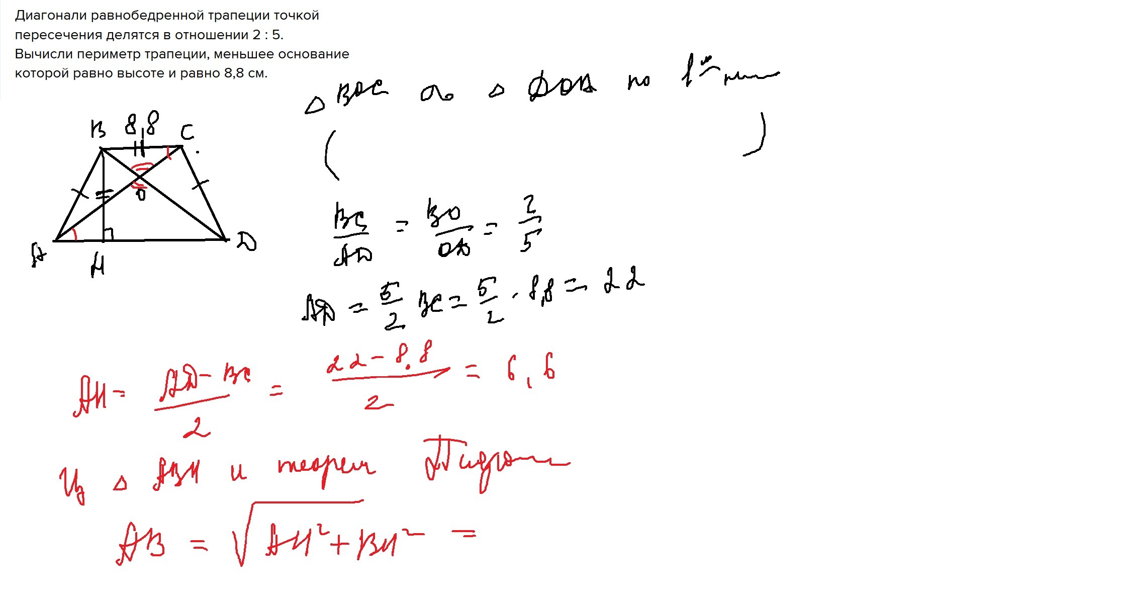 Вычисли периметр трапеции, меньшее основание которой равно высоте и равно 8,8 см.