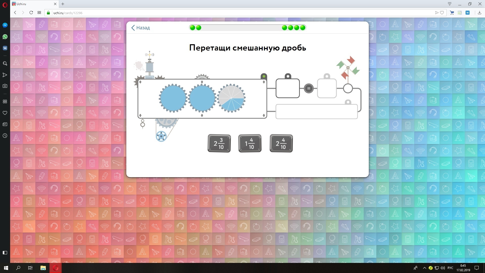 по рисунку видно, что две "шестерёнки" - целые. А вот в третьей закрашено 4 из десяти. То есть, ответ будет 2 целых 4 десятых.