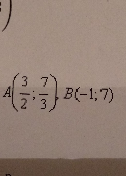 Ответ: Уравнение ищем в виде y=k*x+b. Коэффициент k=(yb-ya)/(xb-xa)=(7=7/3)/(-1-3/2)=14/3:(-5/2)=-28/15. Коэффициент b ищем как 7=-28/15*(-1)+b⇒b=7-28/15=(105-28)/15=77/15. Искомое уравнение y=-28*x/15+77/15.