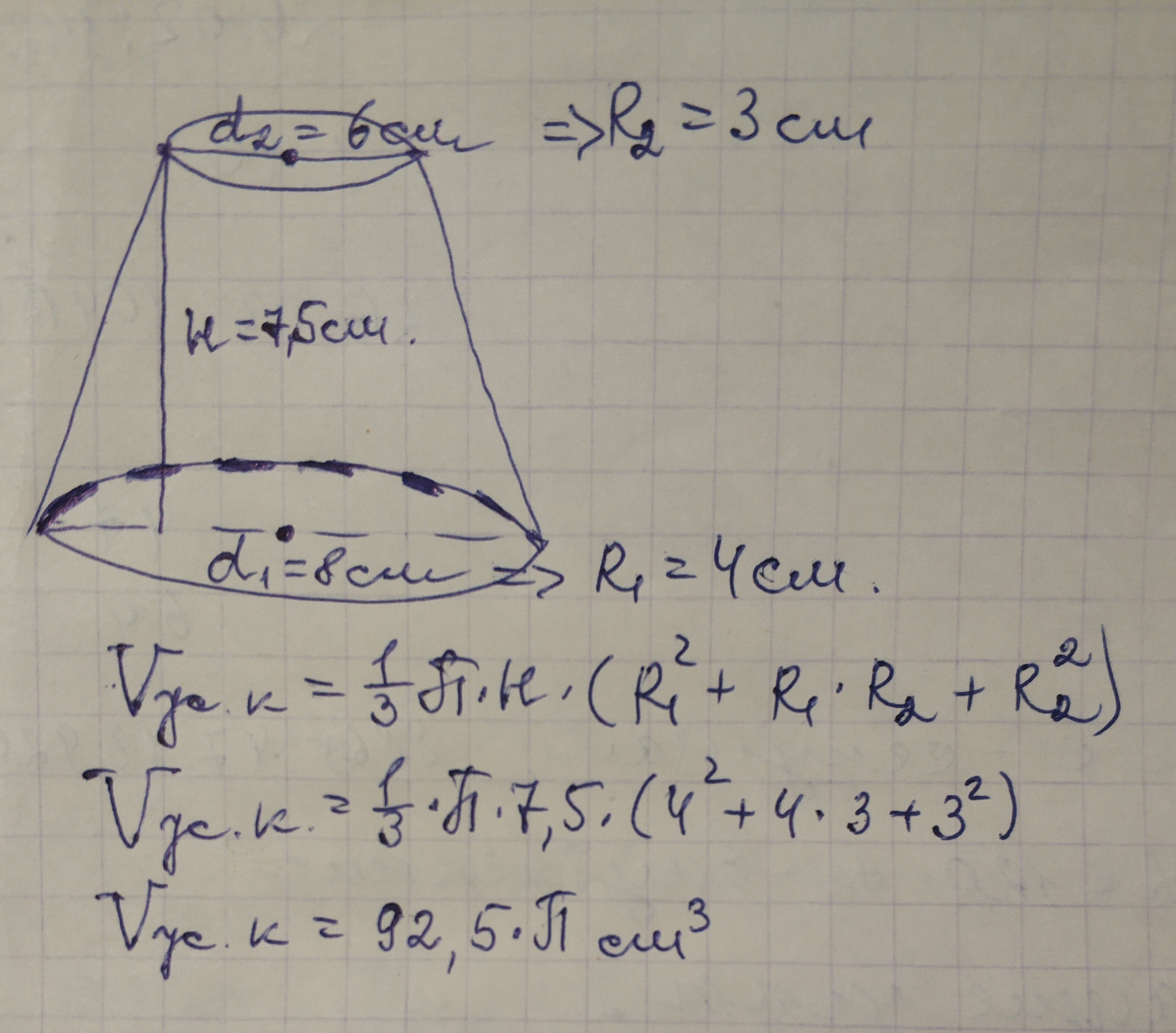 Коробочка йогурта имеет форму усеченного конуса, диаметр большего основания которого равен 8 см, меньшего 6 см, а высота 7,5 см. Найти объем коробочки.
