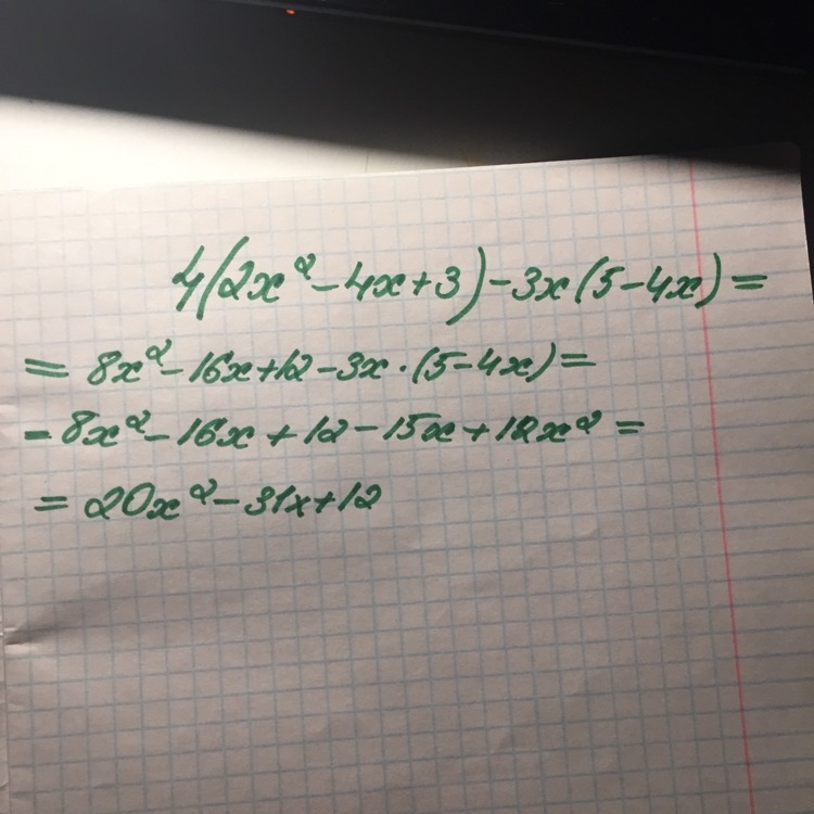 4(2x^2-4x+3)-3x(5-4x)=8x^2-16x+12-15x+12x=8x^2-19x+12