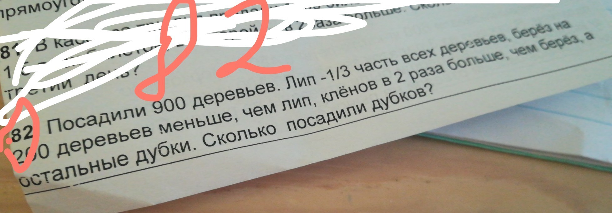 посадили 900 деревьев. Лип 1/3 часть всех деревьев, берез на 200 деревьев меньше, чем лип, кленов в 2 раза больше, чем берёз, а остальные Дубки. Сколько посадили дубков ? 1 - 4 классы ОТВЕТЬТЕ ПЖ!