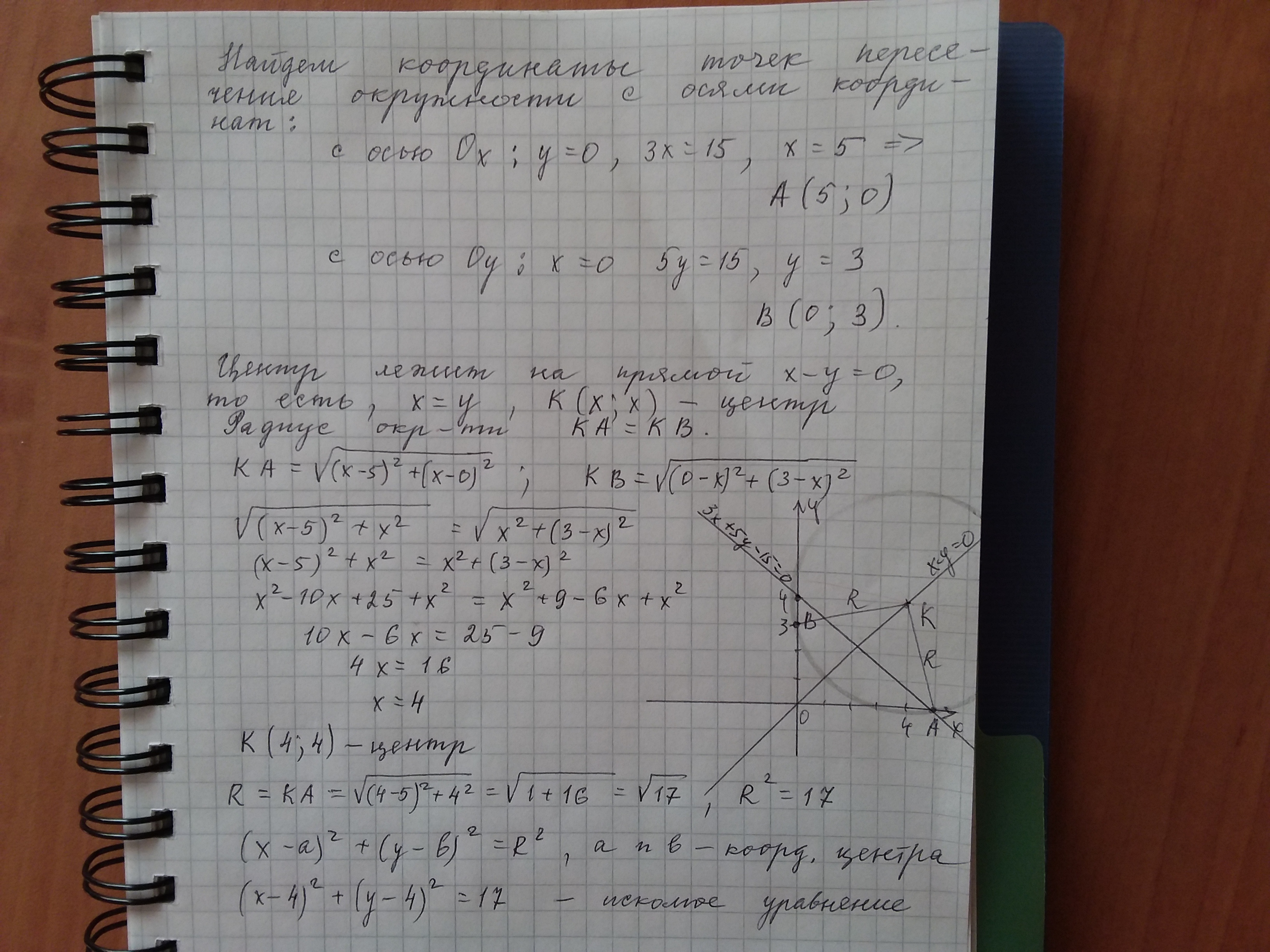 Окружность проходит через точки пересечения прямой 3x + 5y - 15=0 с осями координат, а ее центр лежит на прямой x-y=0, составьте уравнение этой окружности.