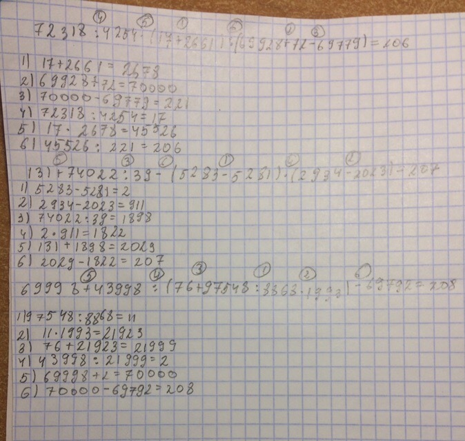 29445 : 453 - 43 · 2311 : 99373; 3) 24610 : 4922 + 95 · 109 - 3 · 3385 - 2; 4) 65956 : (29595 - 6792 - 7 - 6639 + 332) · 51; 5) 130 - 54720 : (7204 - 6064) + 99918 - 15 · 6653; 6) 72318 : 4254 · (17 + 2661) : (69928 + 72 - 69779); 7) 131 + 74022 : 39 - (5283 - 5281) · (2934 - 2023); 8) 69998 + 43998 : (76 + 97548 : 8868 · 1993) - 69792.