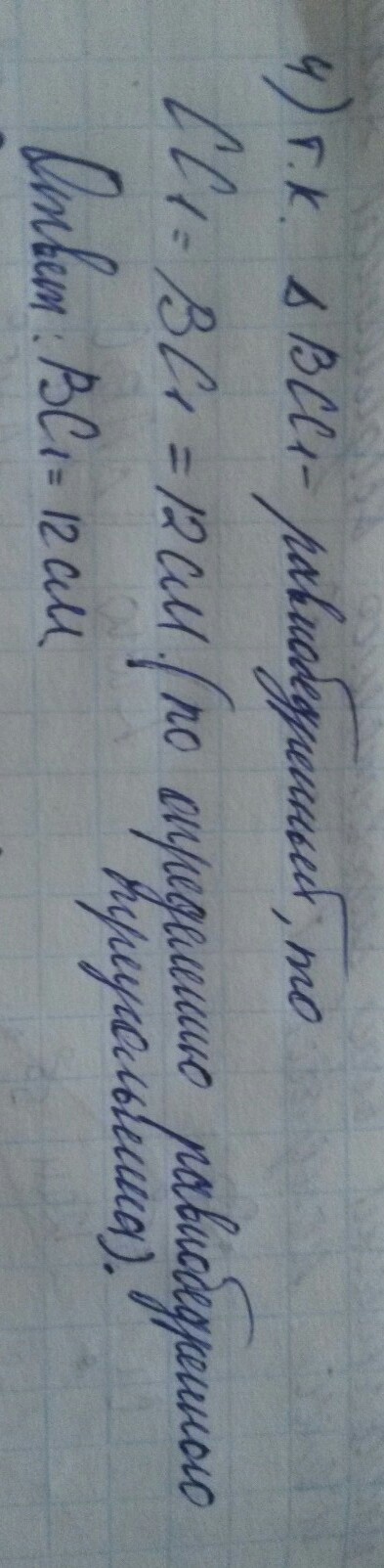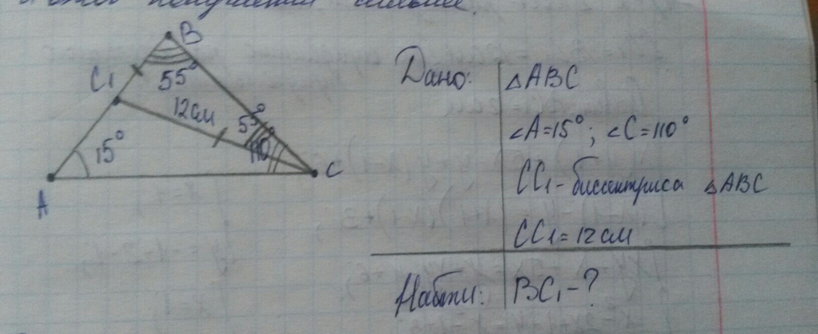 В треугольнике АВС угол А равен 15°, угол С равен 110°, СС1 биссектриса треугольника АВС, СС1 равен 12см, Найдите длину отрезка ВС1