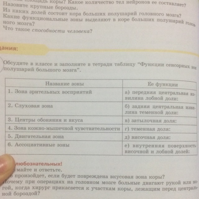 ПОМОГИТЕ ПОЖАЛУЙСТА !!! Обсудите в классе И заполните в тетради таблицу функции сенсорных зон полушарий большого мозга