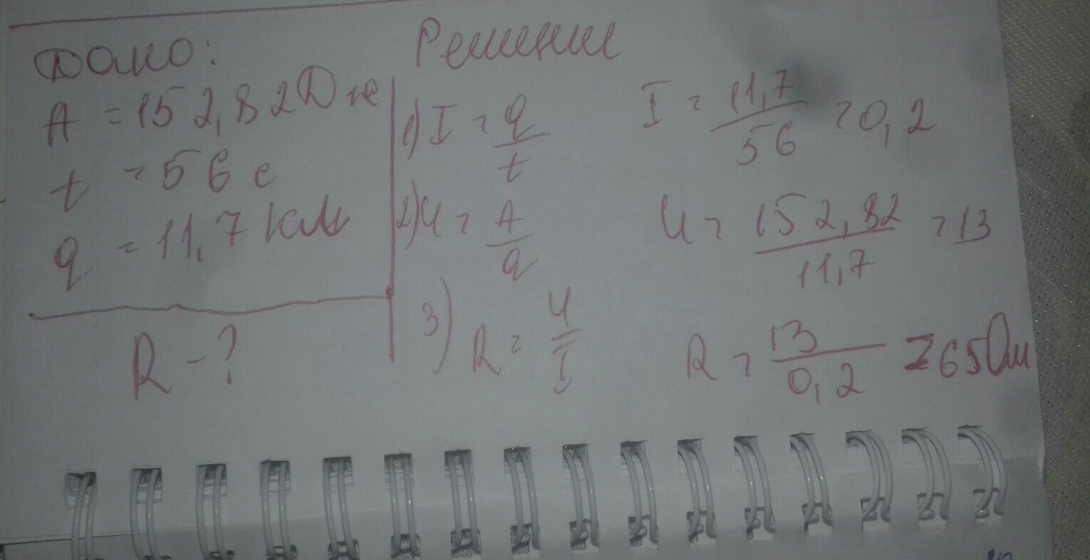 Чему равно сопротивление обмотки электродвигателя, если работа электрического тока составляет 152,82 Дж за 56 с? За время работы электродвигателя через поперечное сечение переносится заряд 11,7 Кл.