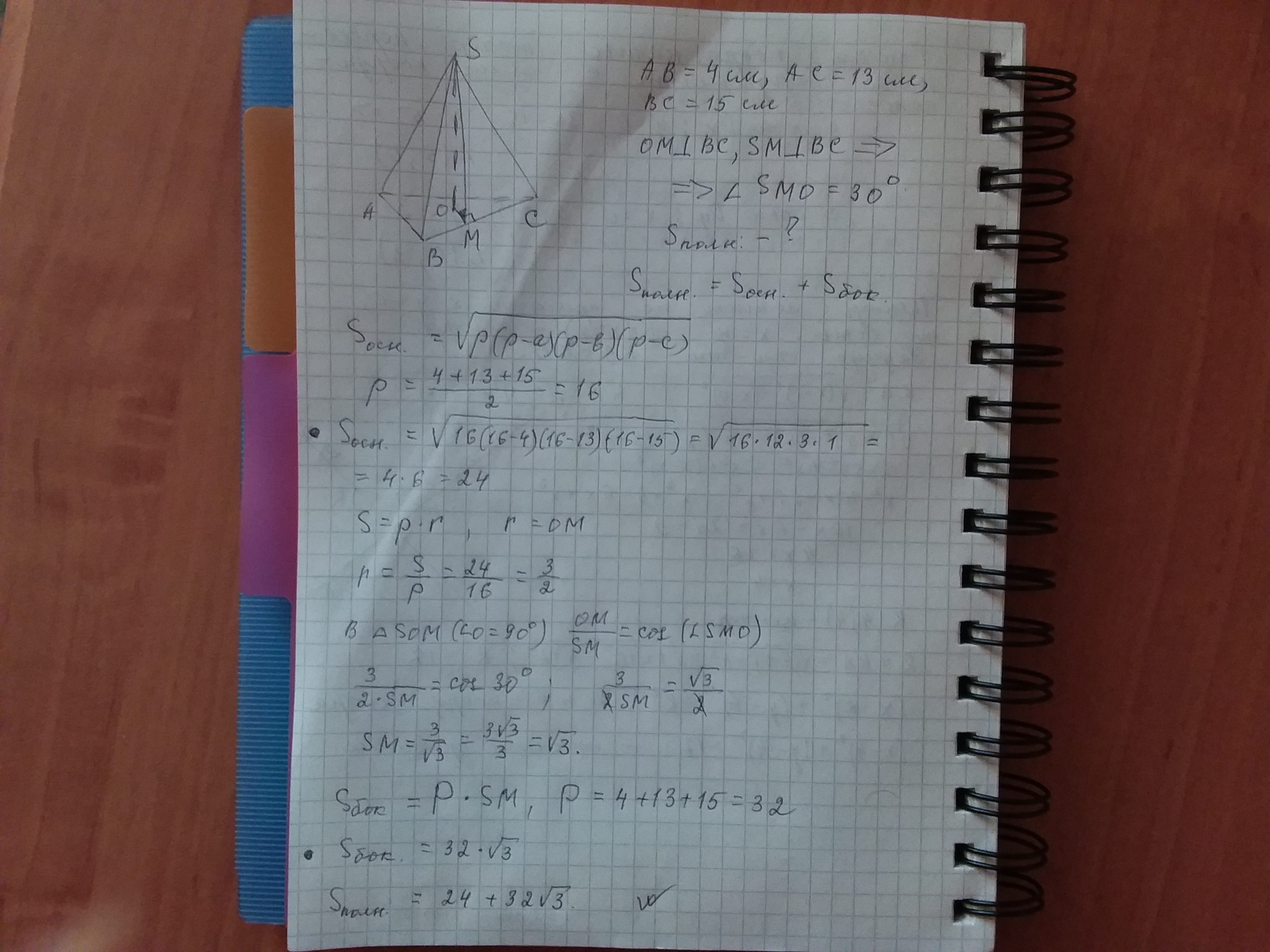 В основании пирамиды лежит треугольник со сторонами 4 см, 13 см, 15 см. Найдите площадь полной поверхности пирамиды, если двугранные углы при основании пирамиды равны 30◦