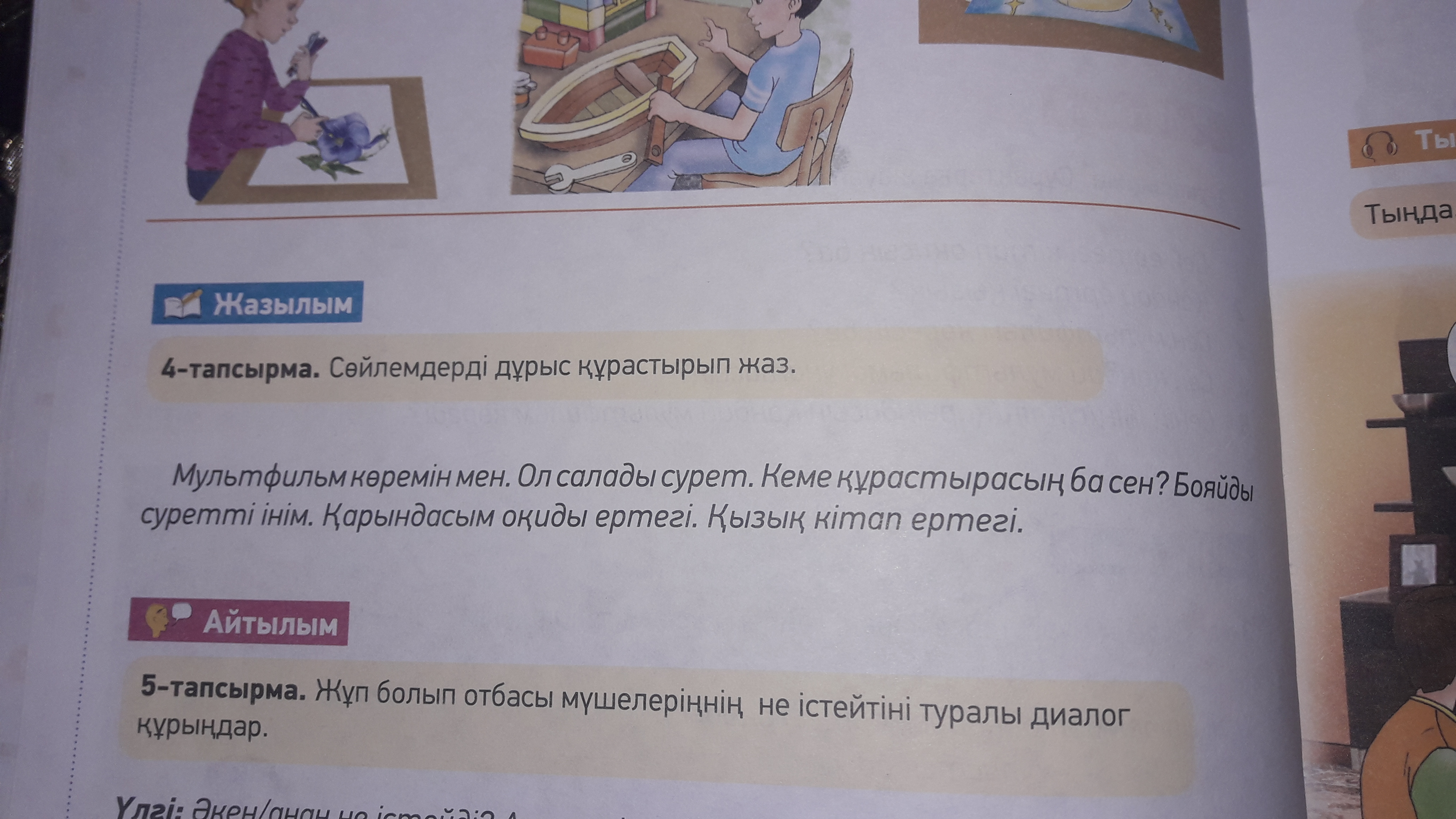 1Мен мультфильм көремін.Ол сурет салады.Сен кеме құрастырасың ба? Інім суретті бояйды.Қарындасым ертегі оқиды.Ертегі қызық кітап
