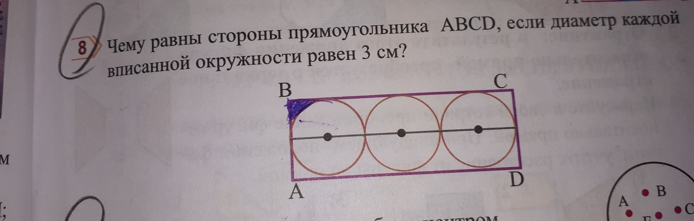 Чему равны стороны прямоулольника АВСD, если диаметр каждой вписанной окружности равен 3см ?
