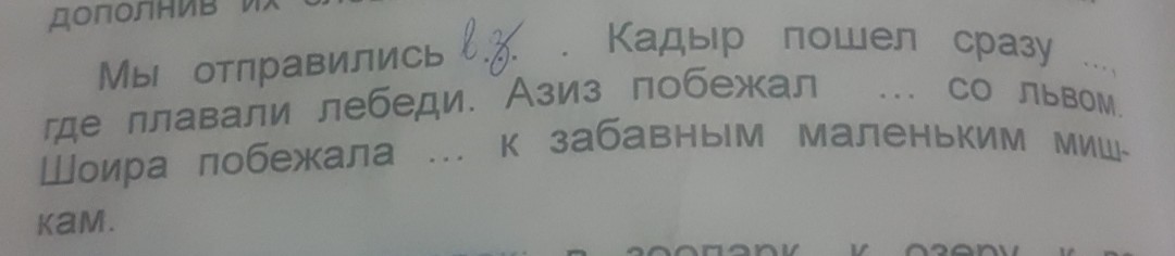 Мы отправились на озеро. Қадір пошёл сразу где плавали лебеди. Азиз побежал у озеру со львом. Шоира побежала к озеру к забавным маленьким мишкам