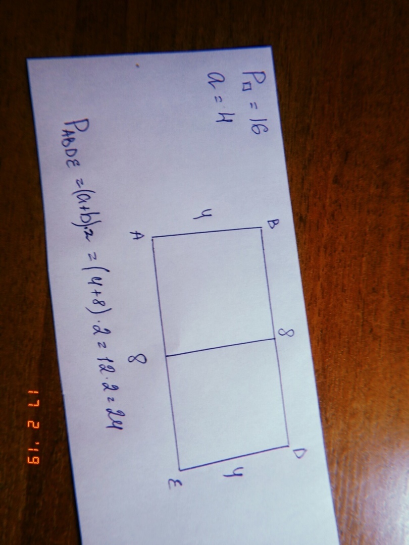 Периметр квадрата равен 16 см . Из двух таких квадратов сложили прямоугольник. Начерти этот прямоугольник. Обозначь вершины буквами. Найди периметр прямоугольника.