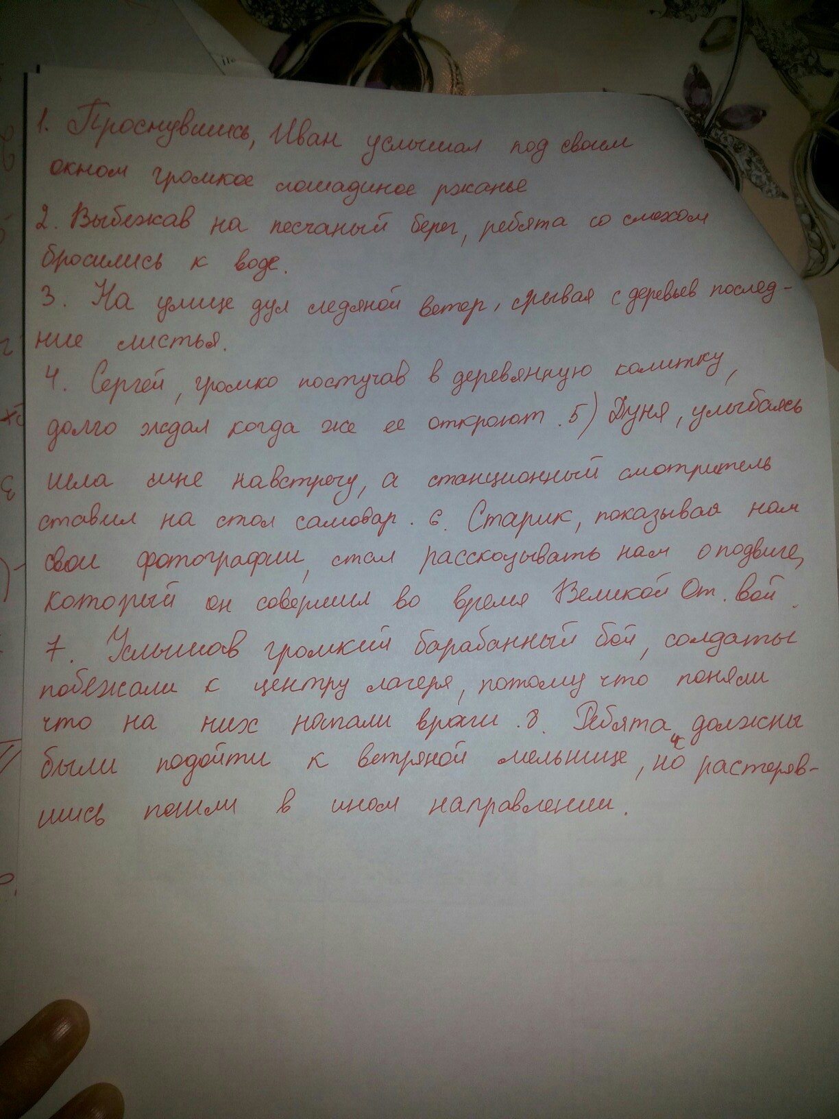 1. Проснувшись, Иван услышал под своим окном громкое лошадиное ржанье. 2.Выбежав на песчаный берег, ребята со смехом бросились к воде.3. На улице дул ледяной ветер, срывая с деревьев последние листья.4.Сергей, громко постучав в деревянную калитку, долго ждал, когда же ее откроют. 5Дуня, улыбаясь, шла мне навстречу, а станционный смотритель ставил на стол самовар. 6.Старик, показывая нам свои фотографии, стал рассказывать нам о подвиге, который он совершил во время Великой Отечественной войны.7.Услышав громкий барабанный бой, солдаты побежали к центру лагеря, потому что поняли, что на них напали враги. 8. Ребята должны были подойти к ветряной мельнице, но, растерявшись, пошли в ином направлении.