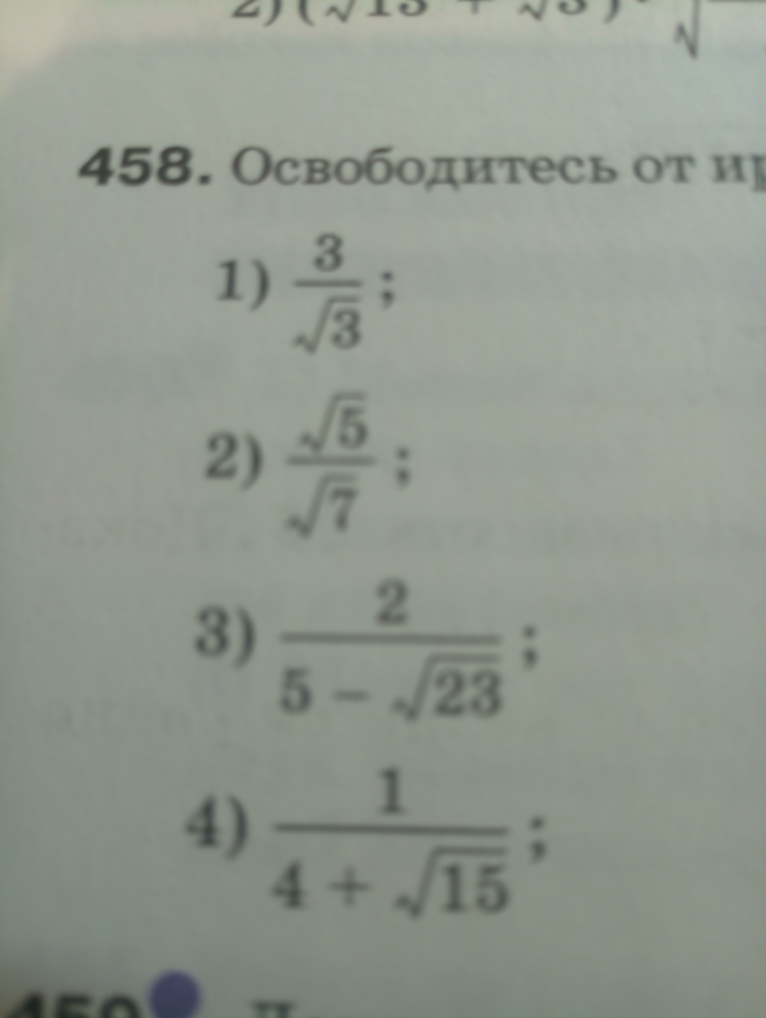 4)1/(4+√15)=(4-√15)/(4+√15)(4-√15)=(4-√15)/ (16-15)=4-√15.