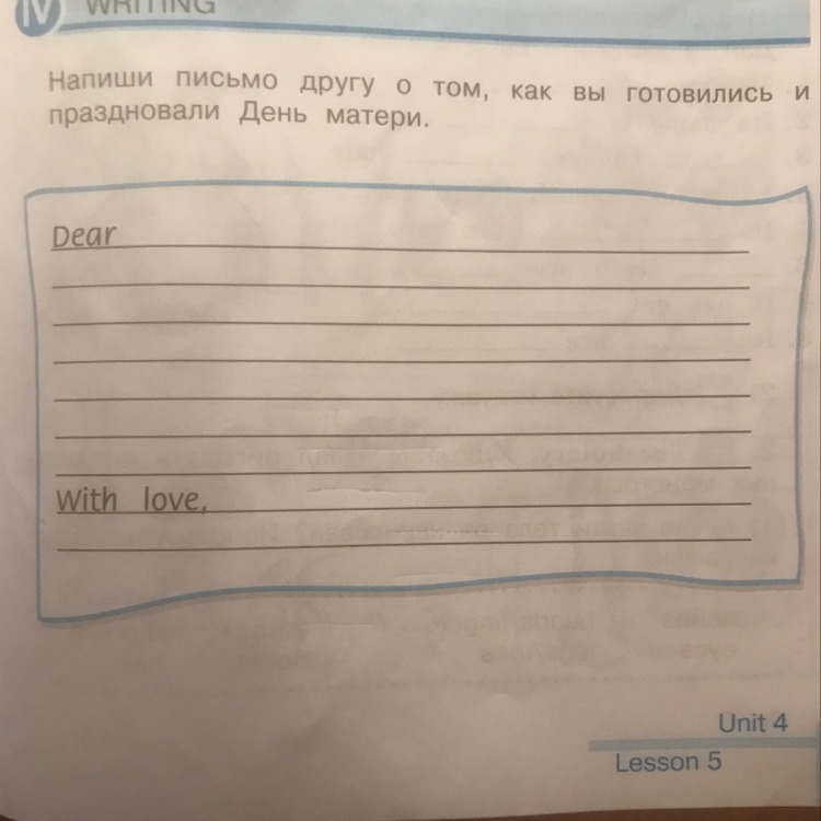 Dear friend Alex. Recently was Mother's Day. On this day, my dad prepared a surprise for my mom. He gave her a bouquet of flowers. My sister gave mom chocolate. And I presented a postcard with congratulations. After presenting the gifts, we went to the amusement park with the whole family. We had a lot of fun . With love (твое имя)
