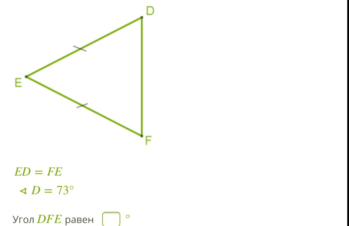 Этот треугольник равнобедренный ( так как ED=FE) , следовательно угол DFE=уголу EDF = 73 градуса