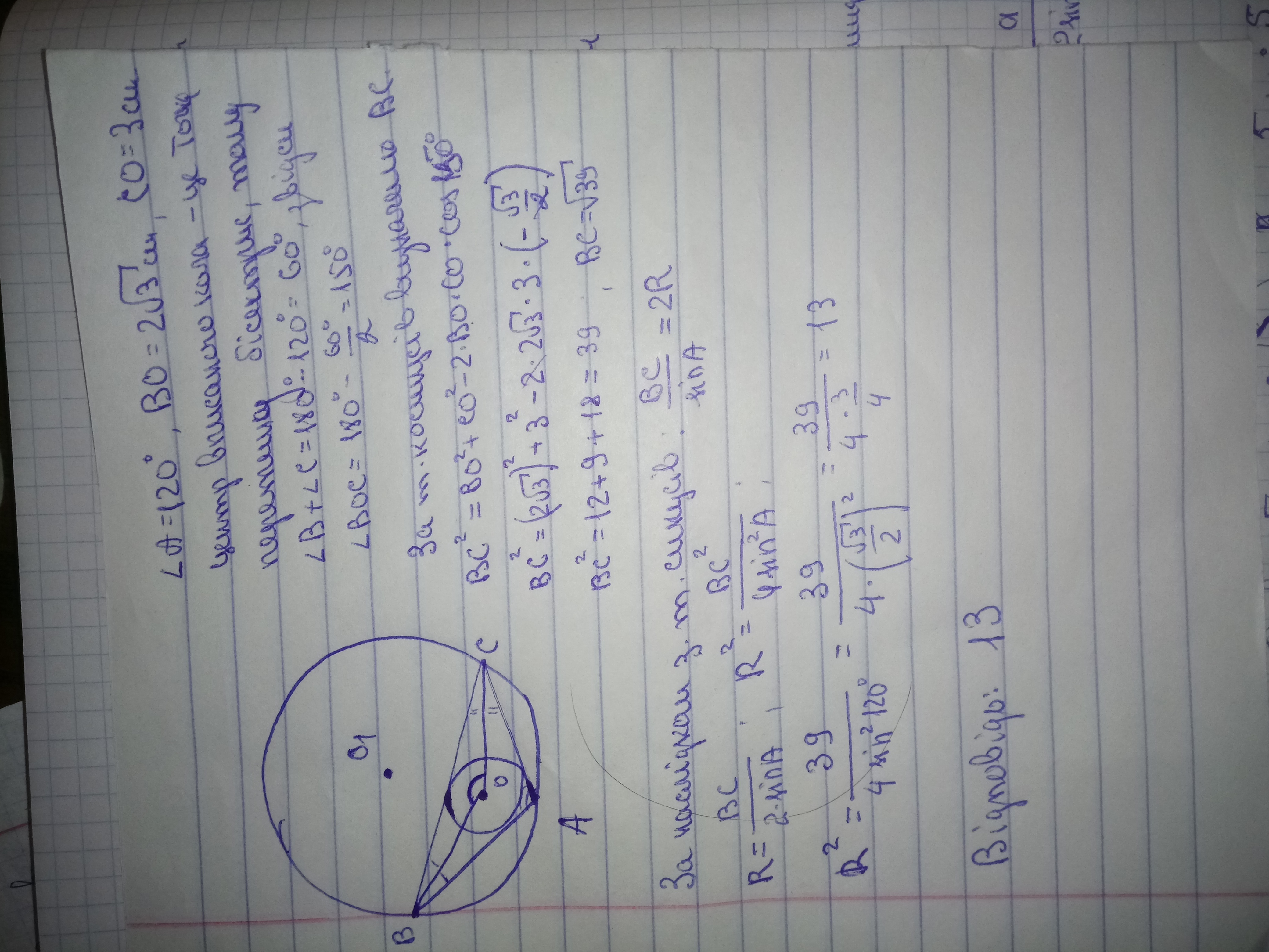 R = BC/(2sin120°) = √39/(2*(√3/2)) = √13 ≈ 3,6056 см.