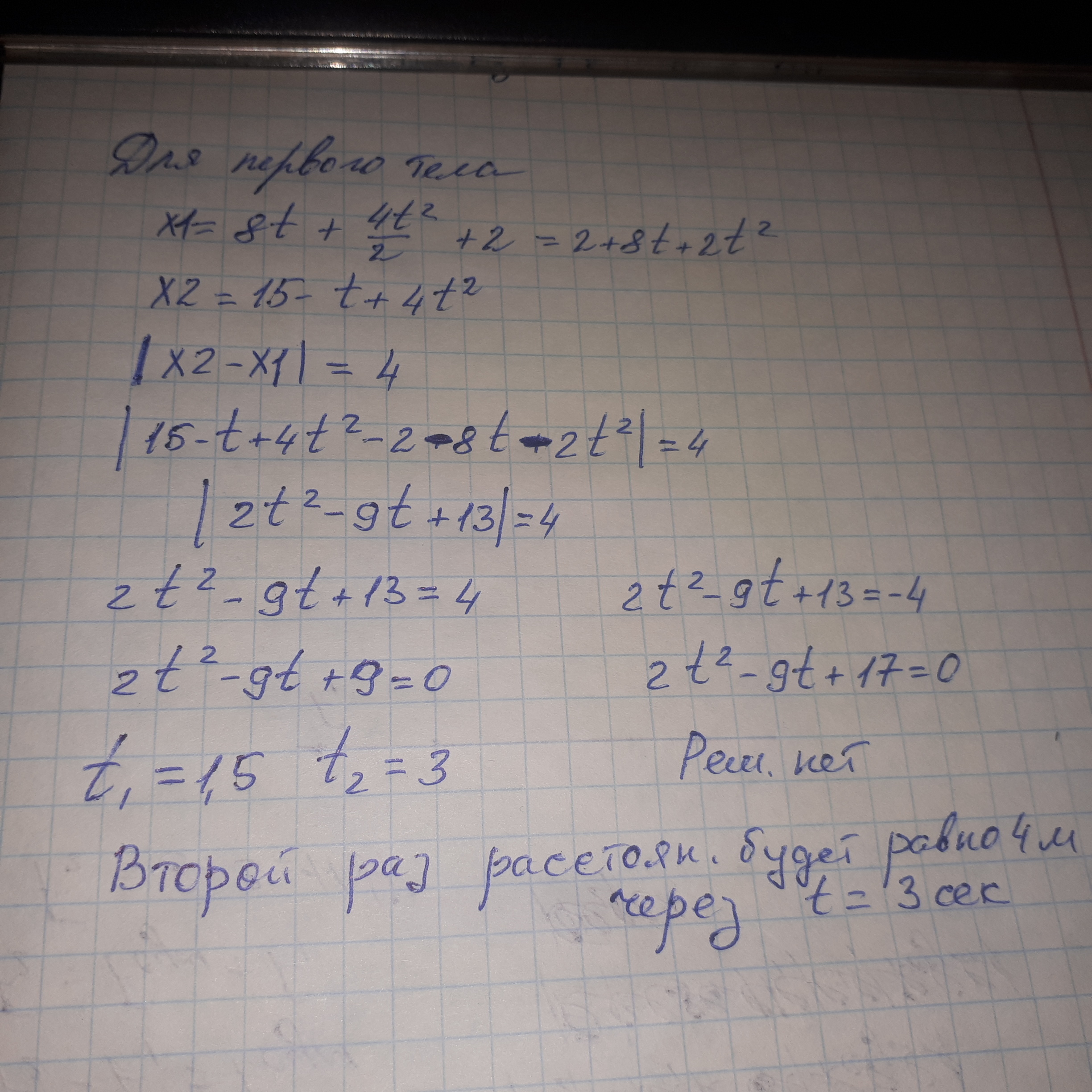 В момент начала наблюдения первое тело проходит координату 2 м так, что его скорость меняется по закону v1=8+4t. Уравнение координаты второго тела X2=15-t+4t^2. В какой момент времени от начала наблюдения расстояние между телами второй раз окажется равным 4 м?