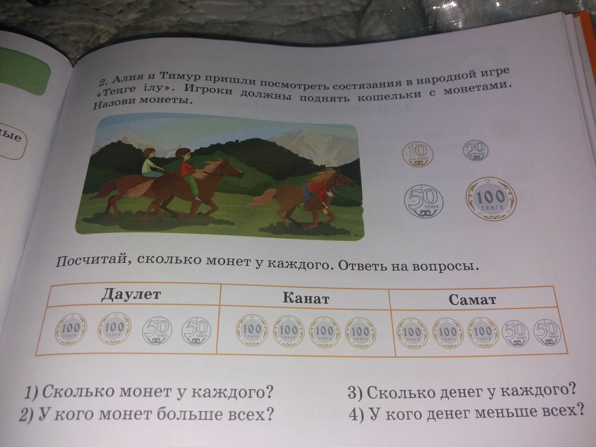 Алия и Тимур пришли посмотреть состязание в народной игре Викинги лучшие игроки должны поднять кошельки с монетами Назови монеты