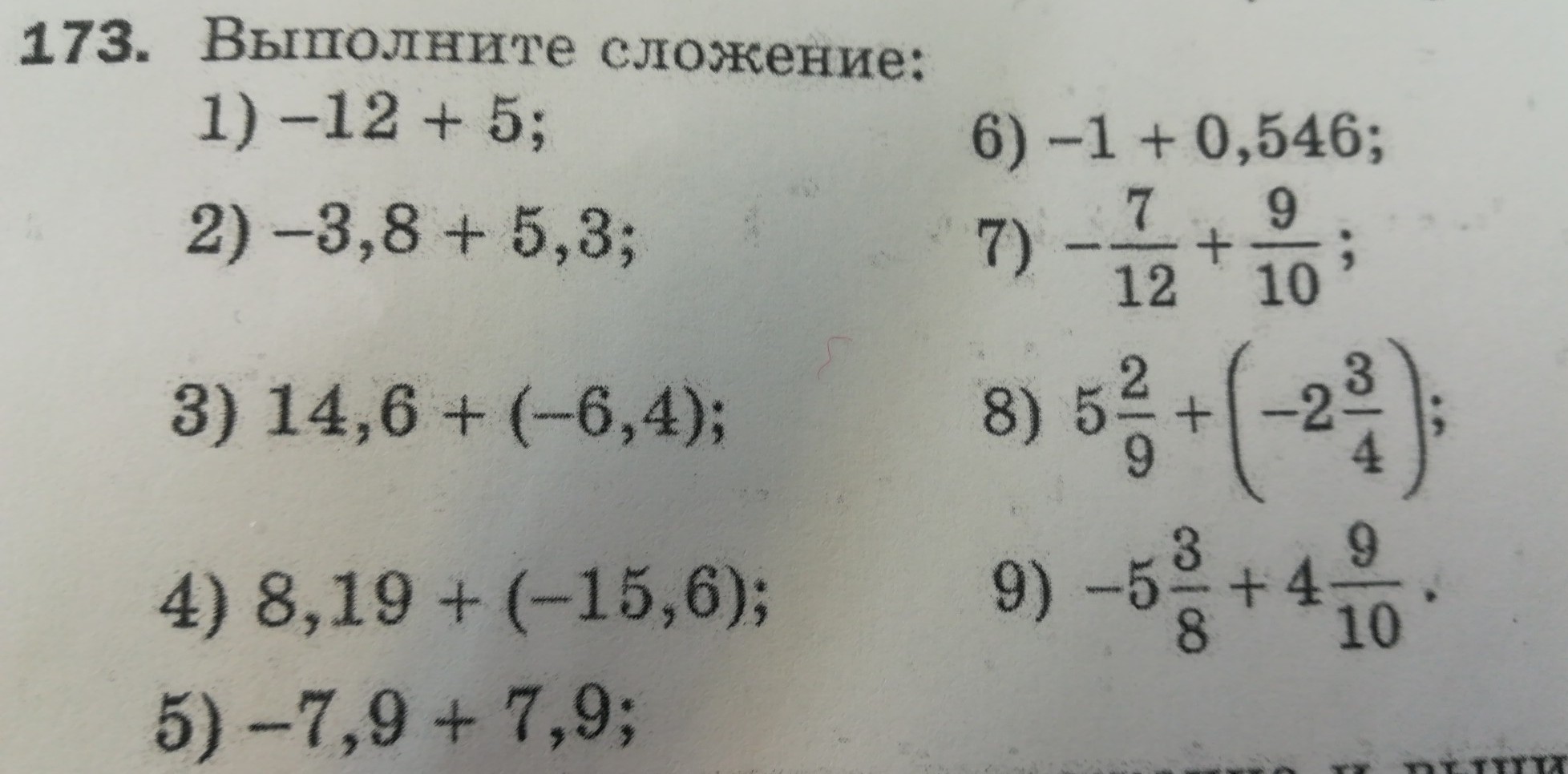 1) - 12 + 5 =  - 6 \ 2) - 3.8 + 5.3 = 1.5 \ 3)14.6 + ( - 6.4) = 14.6 - 6.4 = 8.2 \ 4)8.19 + ( - 15.6) = 8.19 - 15 .6 =  - 7.41 \5) - 7.9 + 7.9 = 0 \ 6) - 1 + 0.546 =  - 0.454 \ 7) -  frac{7}{12}  +  frac{9}{10}  =  frac{ - 35 + 54}{60}  =  frac{29}{60 }  \ 8) 5frac{2}{9}  + ( -  2frac{3}{4}) = 5 frac{8}{36}  - 2 frac{27}{36}  = 2 frac{17}{36}  \ 9) - 5 frac{3}{8}  + 4 frac{9}{10}  =  - 5 frac{15}{40}  + 4 frac{36}{40}  =  -  frac{19}{40}