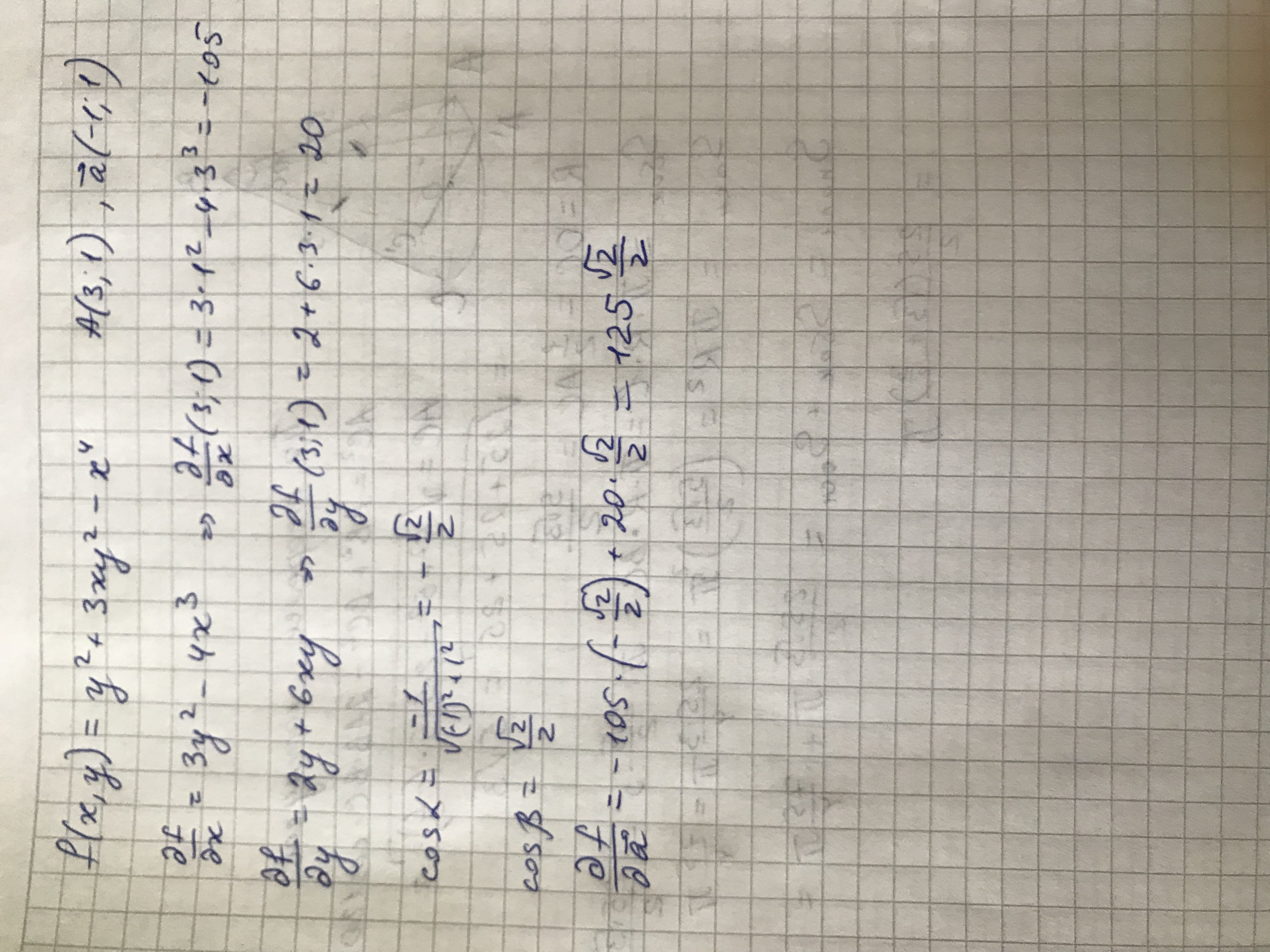 2) f (x;y) =y^2+3xy^2-x^4 в точке А (3;1) в направление вектора -> =(-1; 1)