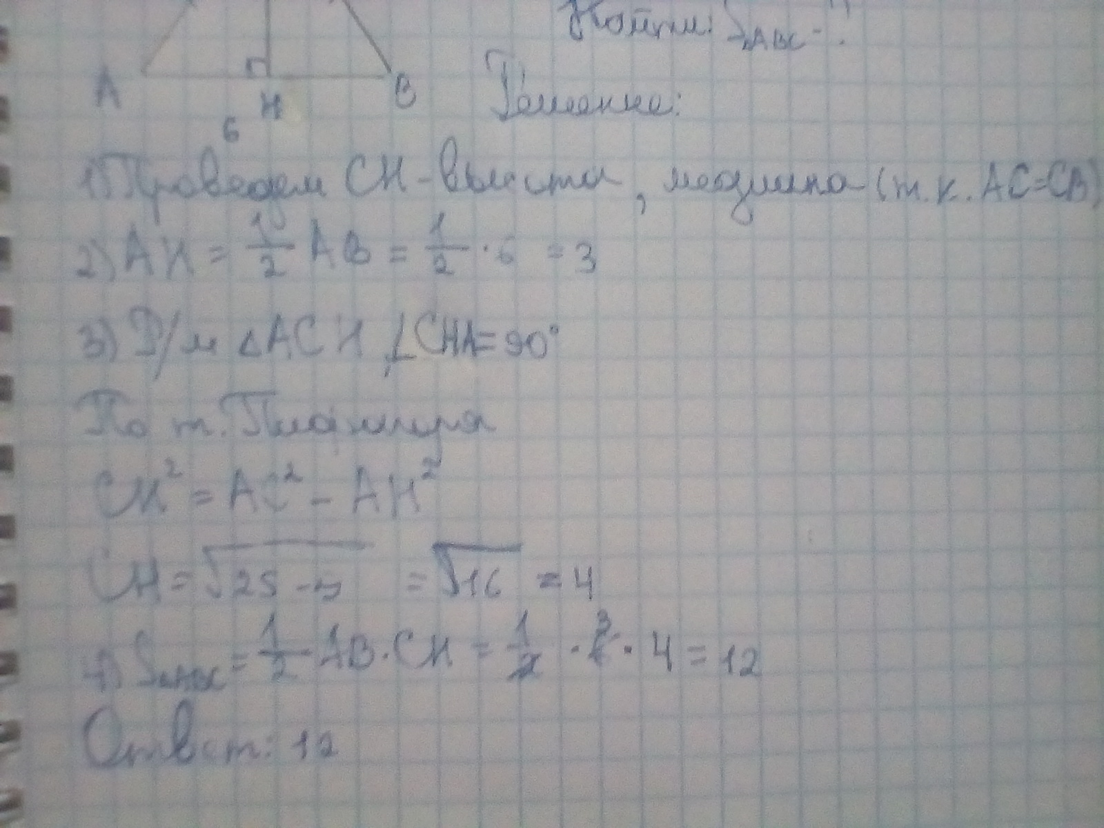основание равнобедреного ттреугольника равно 6 аего боковая сторона равна 5 найдите площадь равнобедреного треуголька