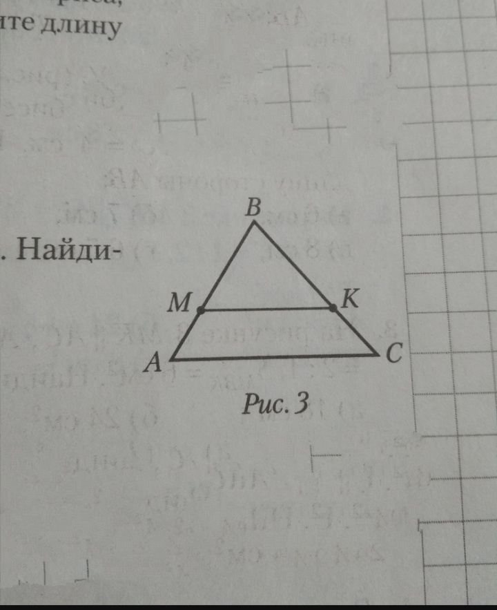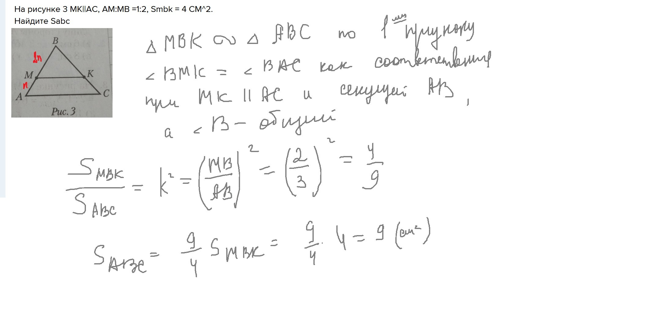 На рисунке 3 MK||AC, AM:MB =1:2, Smbk = 4 СМ^2. Найдите Sabc