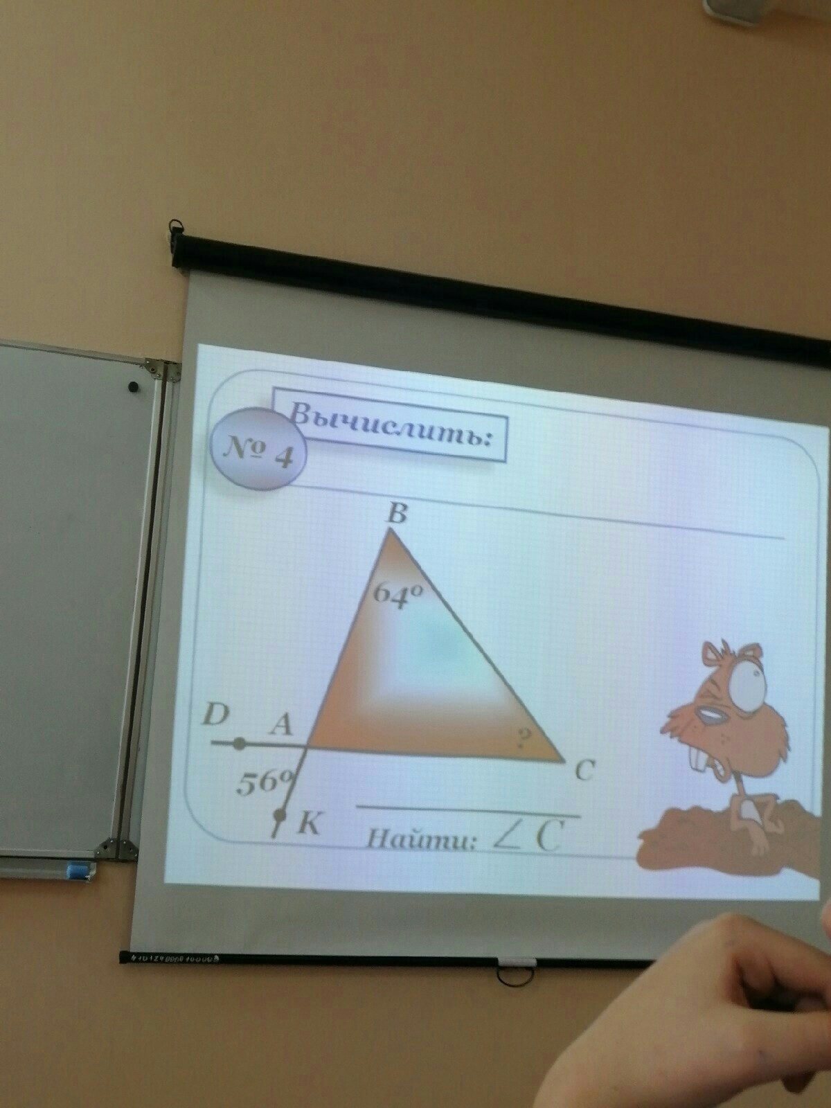 Угол DAK = BAC,как вертикальные(56 градусов они),тогда угол C = 180-64-56=60 градусов