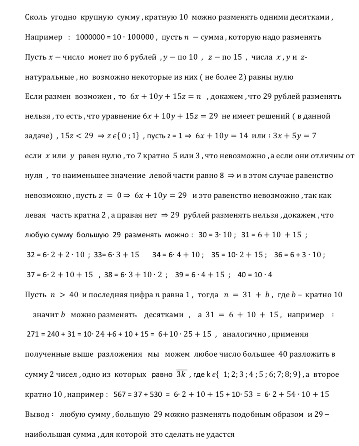 Докажите что с помощью 6-ти рублёвых монет 10-ти рублёвых, 15-ти рублёвых монет можно разменять большую сумму денег. Какую наибольшую сумму денег нельзя разменять