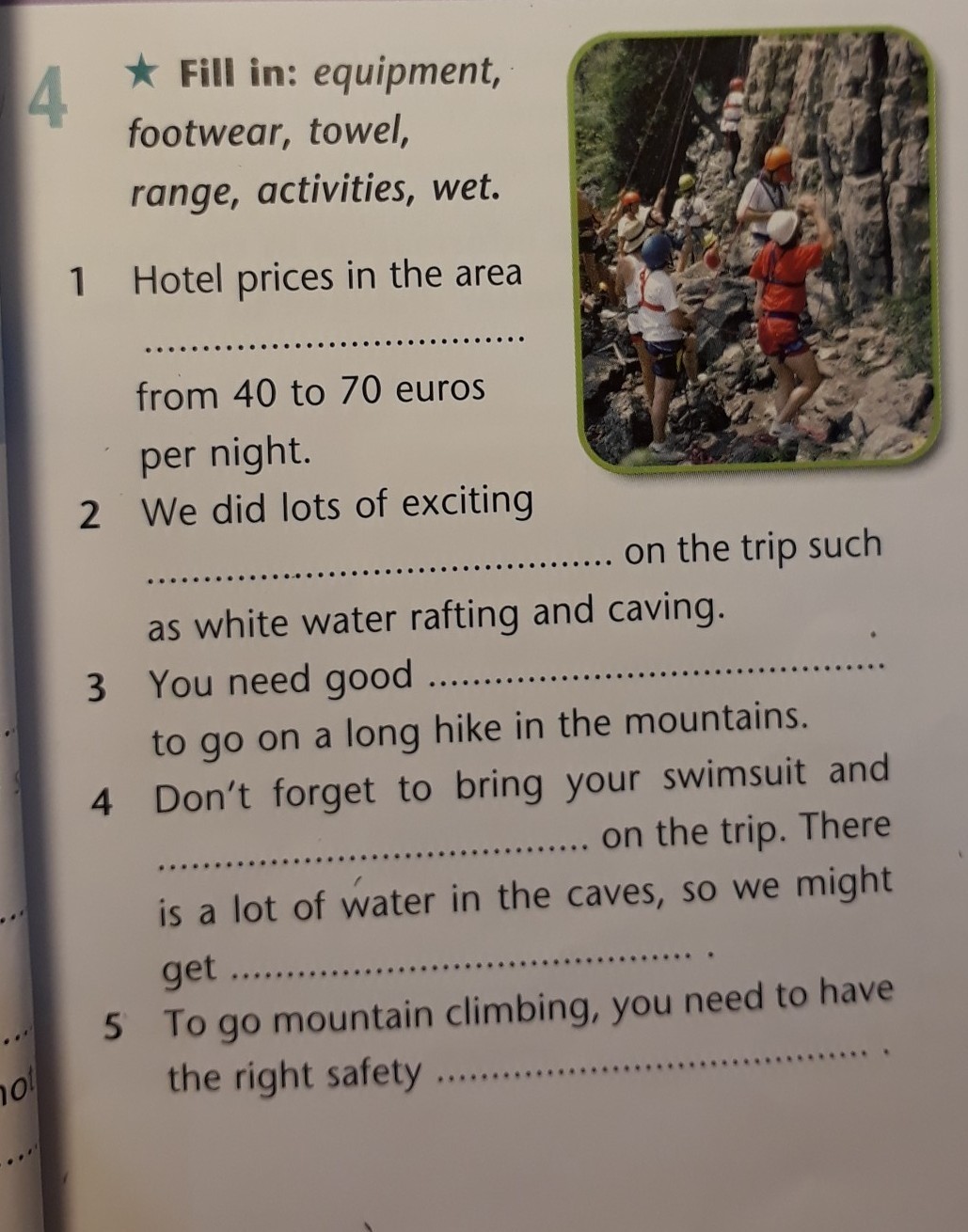 4 Fill in: equipment, footwear, towel, range, activities, wet.