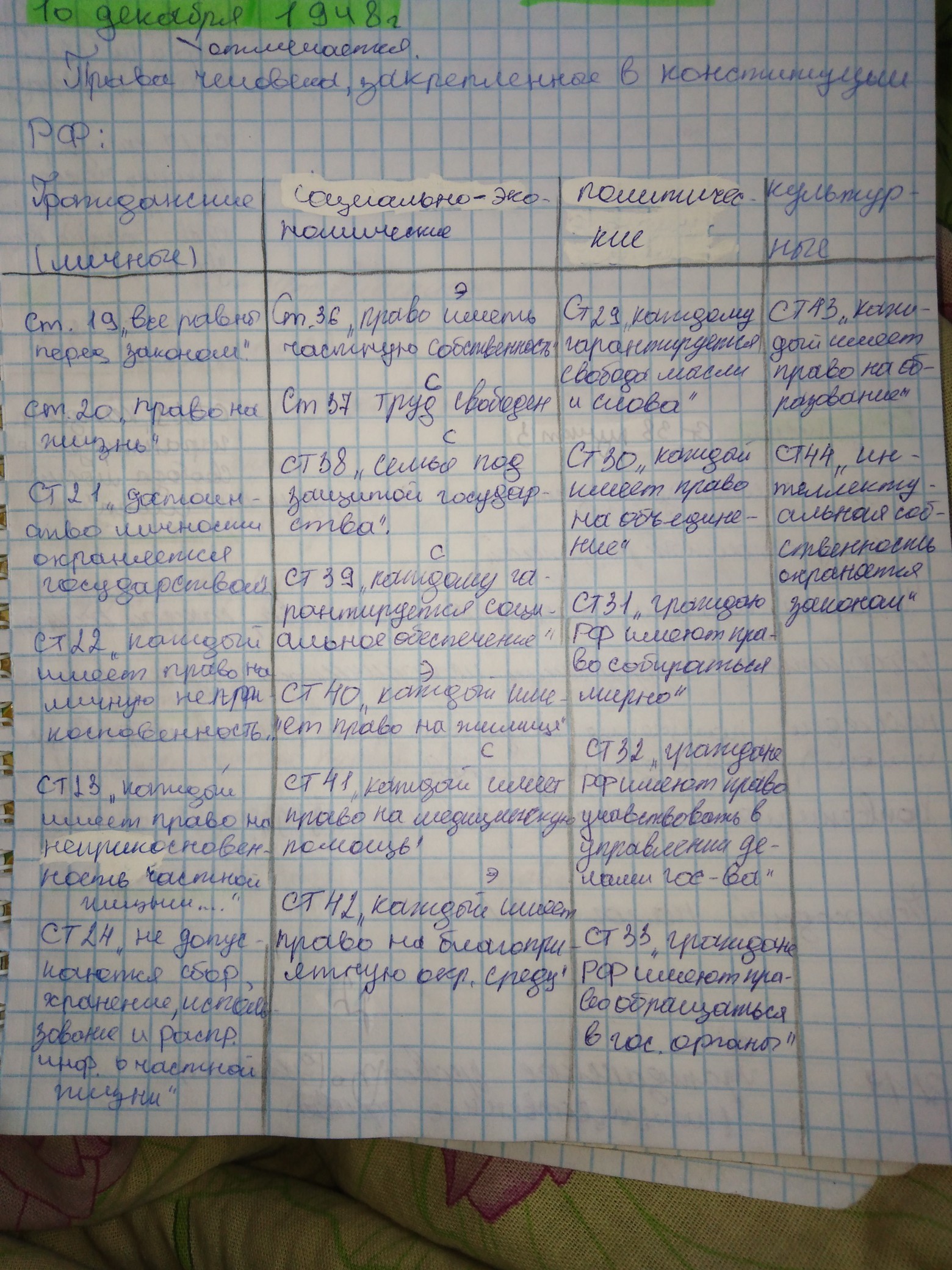 В таблице указать конкретные статьи Конституции на каждую группу прав.