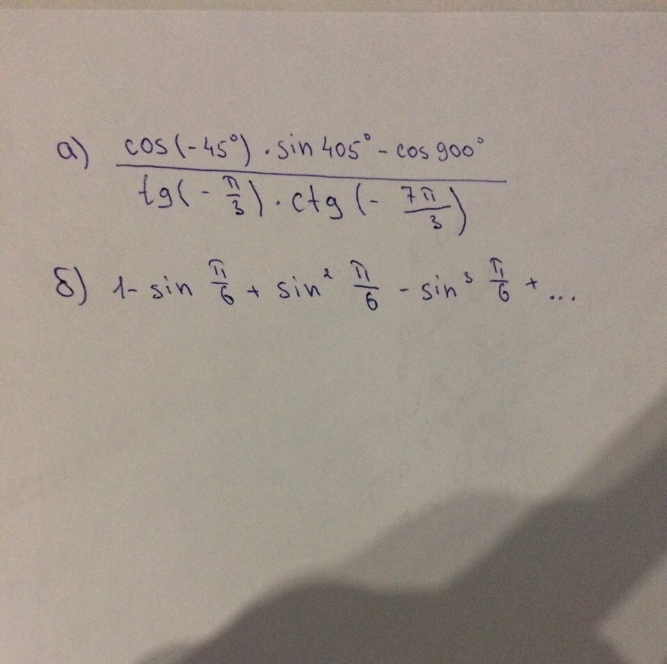 2); ; 1-sinfrac{pi}{6}+sin^2frac{pi}{6}-sin^3frac{pi}{6}+,,,=1-frac{1}{2}+(frac{1}{2})^2-(frac{1}{2})^3+...=\\=Big (underbrace {1+(frac{1}{2})^2+(frac{1}{2})^4+...}_{b_1=1; ,; q=frac{1}{4}}Big )-Big (, underbrace {frac{1}{2}+(frac{1}{2})^3+(frac{1}{2})^5+...}_{b_1=1/2; ,; q=frac{1}{4}}Big )=\\=frac{1}{1-(frac{1}{2})^2}-frac{frac{1}{2}}{1-(frac{1}{2})^2}=frac{1-frac{1}{2}}{1-frac{1}{4}}=frac{frac{1}{2}}{frac{3}{4}}=frac{2}{3}