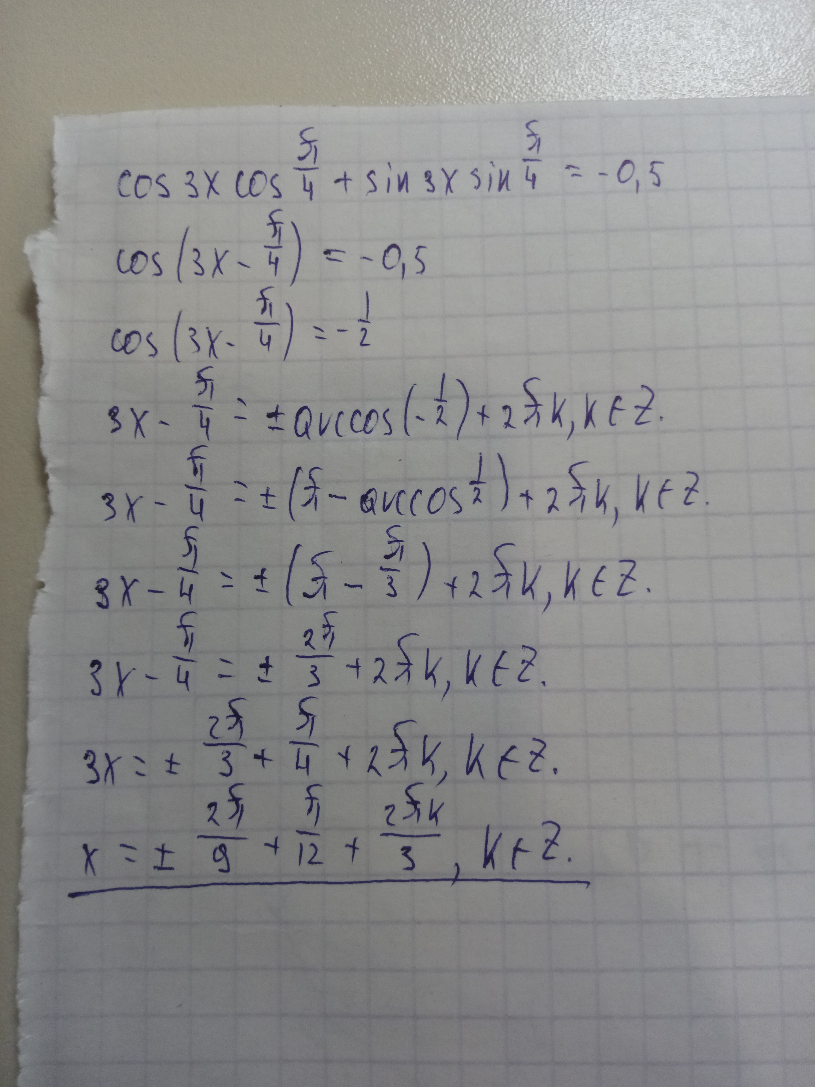 cos(3x)•cos(π/4) + sin(3x)•sin(π/4) = - 0,5