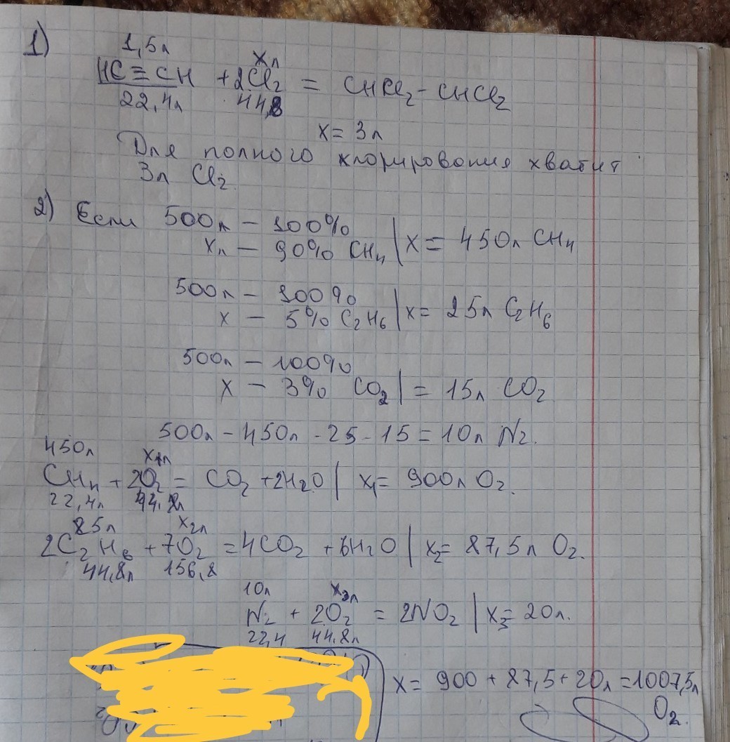 2)в одному з родовищ природний газ містить 90% метану , 5%етану , 3% вуглекислого газу і 2% азоту . Який об'єм повітря потрібний для спалювання цього газу об'ємом 500л(в одном из месторождений природный газ содержит 90% метана, 5% этана, 3% углекислого газа и 2% азота. Какой объем воздуха необходимый для сжигания этого газа объемом 500л)?