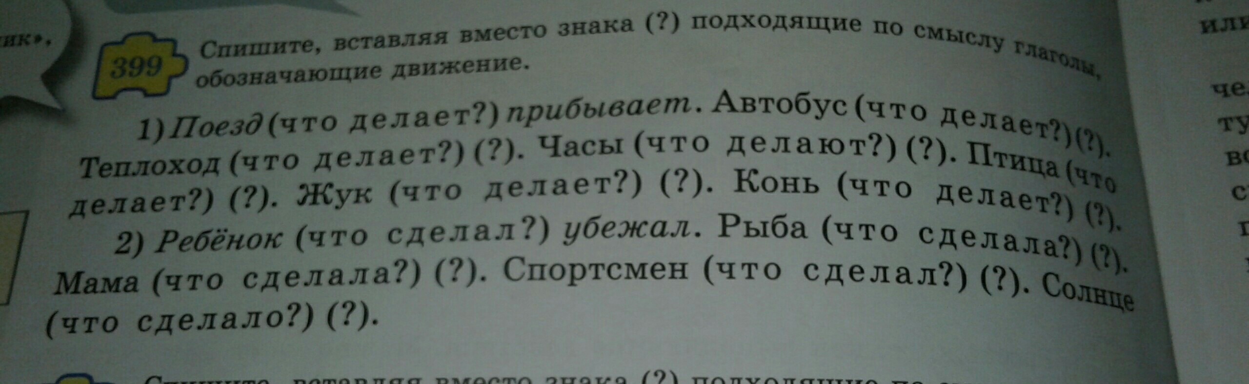 Автобус подъезжает. Теплоход подплывает. Часы тикают.Птица подлетает. Жук подползает. Конь подбегает ( или убегает).