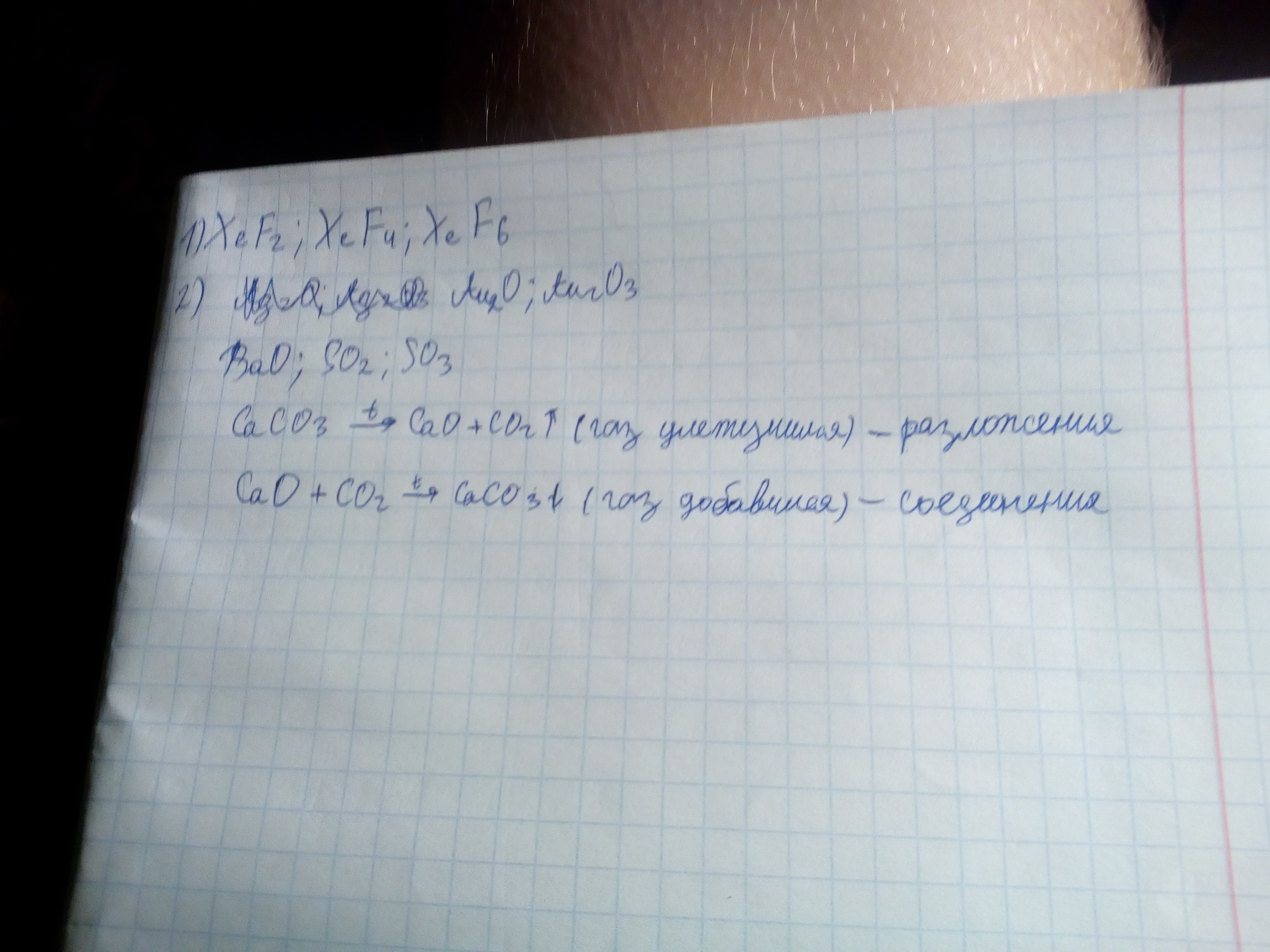 Помогите, пожалуйста. 1. С одновалентным фтором ксенон образует соединения, в которых он двух-, четырёх- и шестивалентен. Напишите формулы этих соединений. 2. Напишите формулы: а) двух оксидов золота, в одном из которых золото одновалентно, а в другом – трёхвалентно; б) оксида бария; в) двух оксидов серы, в одном из которых сера четырёхвалентна, а в другом – шестивалентна. 3. Если оксид кальция образуется при нагревании карбоната кальция, то его масса меньше, чем масса взятого вещества; если же оксид образуется при нагревании кальция на воздухе, то его масса больше, чем масса взятого вещества. Дайте объяснения и напишите уравнения этих химических превращений и укажите тип химических реакций.