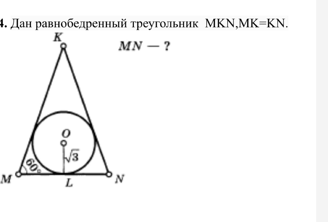 Так как это равнобедренный треугольник, то мы можем найти угол К. 180 - 60*2=60. Значит мы имеем правильный треугольник. В треугольнике центр вписанной окружности находиться на пересечение его биссектрис и высот(так как мы имеем правильный треугольник).